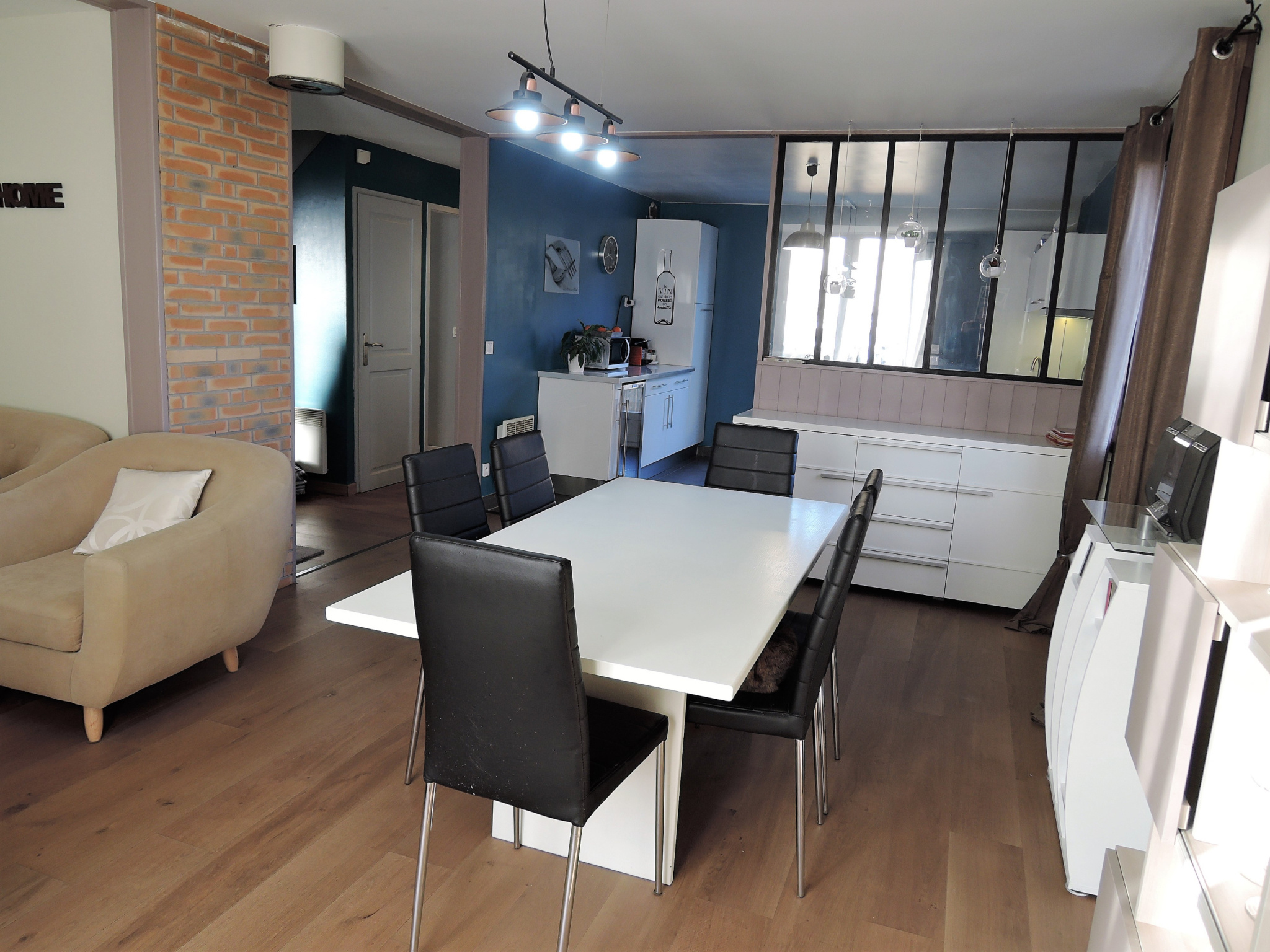 - au rez de chaussée: une entrée et un couloir avec deux placards, un cellier, une buanderie, un WC séparé, une grande salle d'eau moderne et une pièce de vie de 37 m2 ( cuisine équipée avec verrière, salon et salle à manger) avec accès sur une terrasse bois neuve orientée plein sud.
