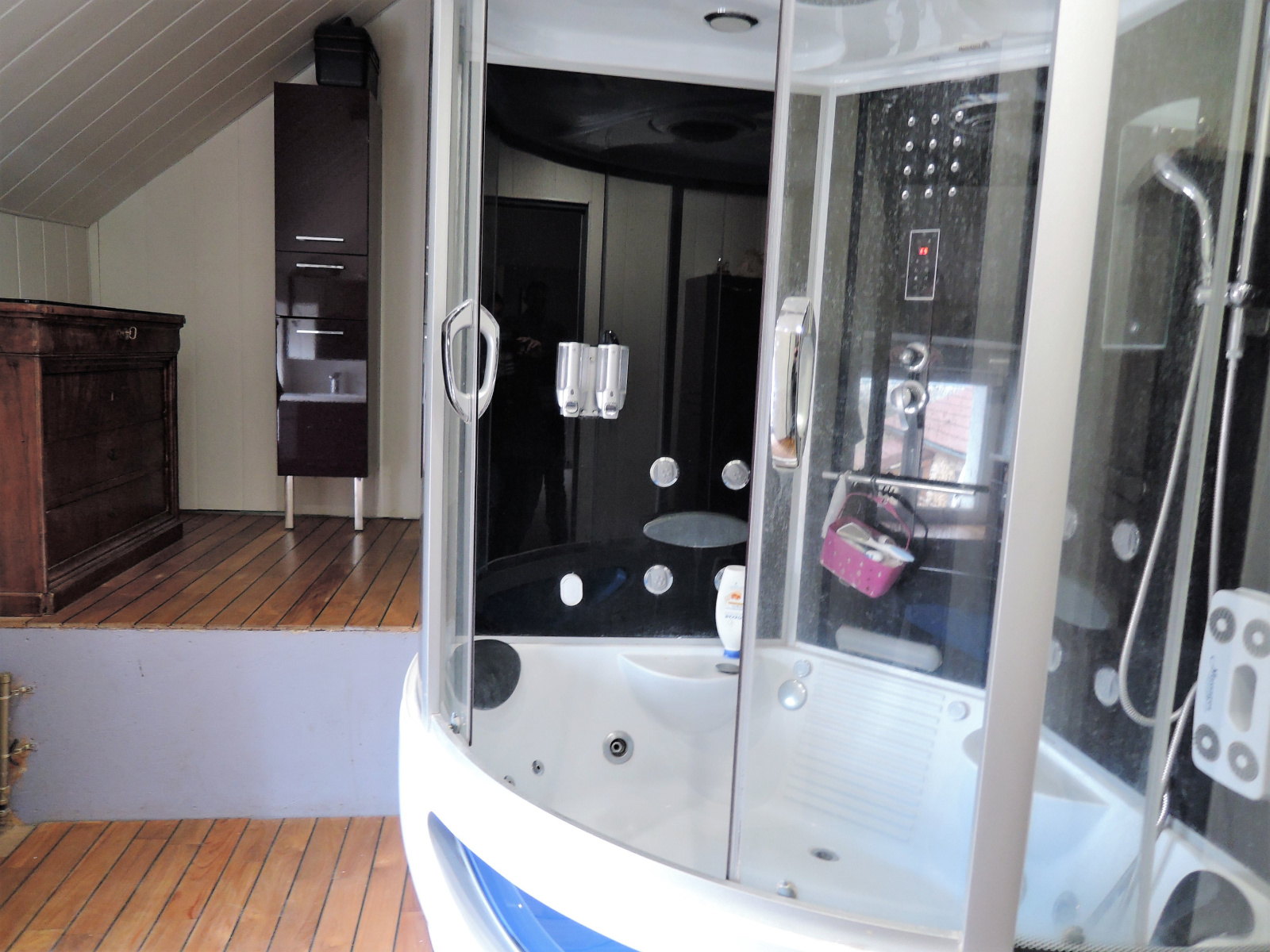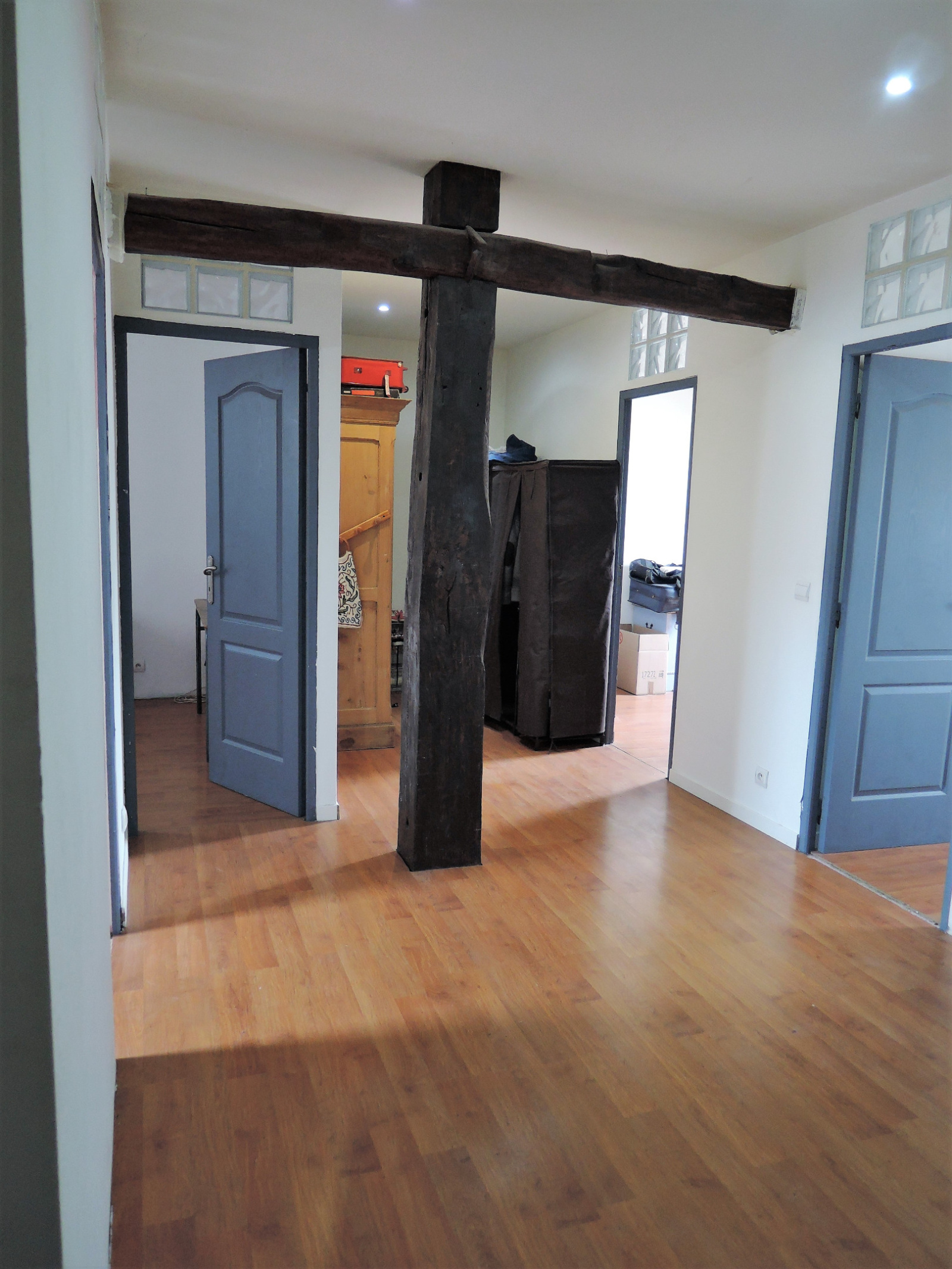 - à l'étage : une mézzanine faisant actuellement office de salon, un palier menant à 4 chambres mansardées avec poutres apparentes, une cinquième pièce de 25 m 2 pouvant servir de 5ème chambre ou de séjour, une salle de bain avec baignoire douche hammam-balnéo et 2 meubles double vasques et des toilettes séparées.