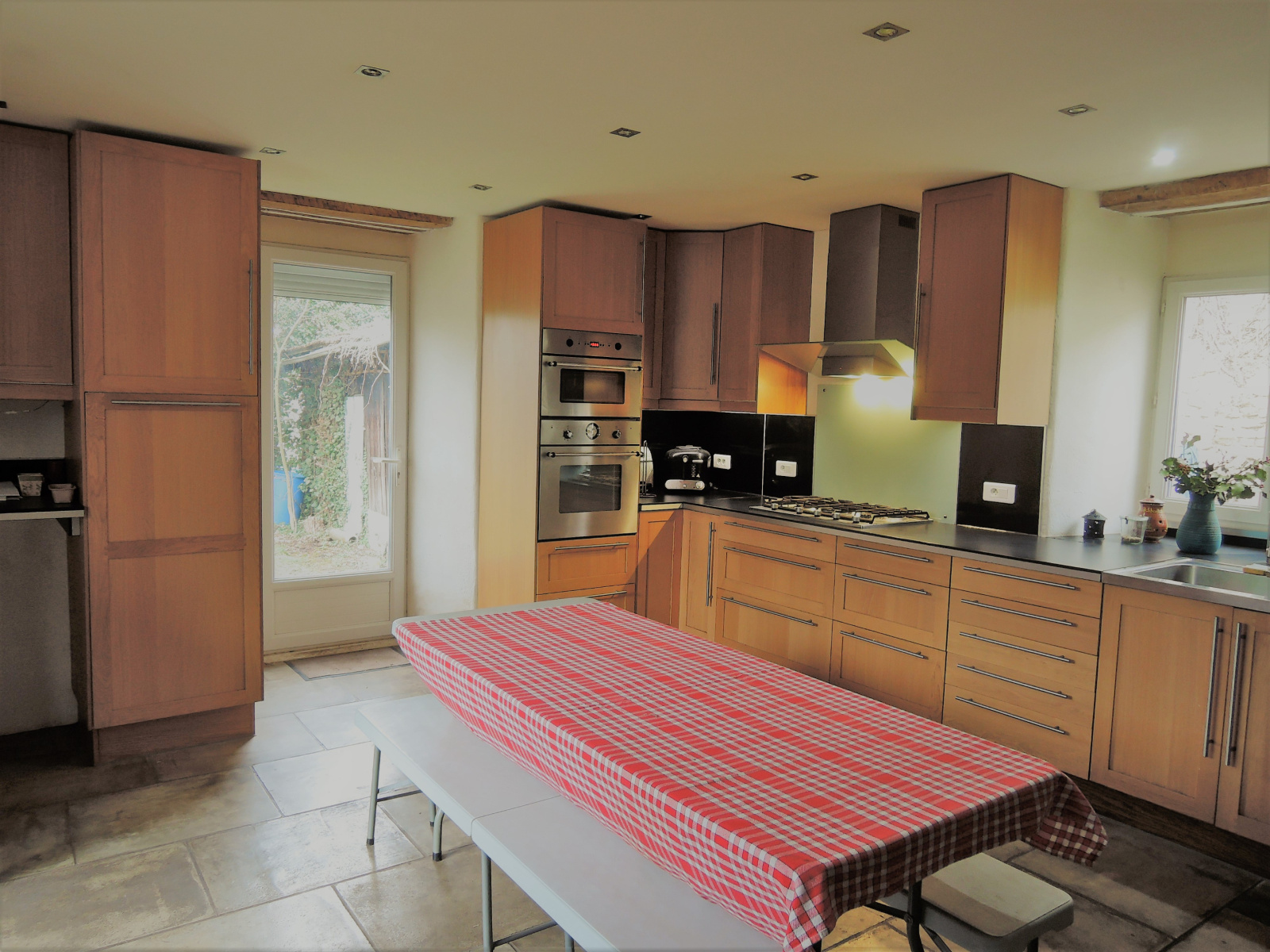 - au rez de chaussée : un hall d'entrée avec poêle à bois desservant l'escalier menant à l'étage, l'accès à une grange accueillant un double garage, des toilettes et une cuisine moderne et équipée de 28 m2 avec double accès sur l'extérieur.