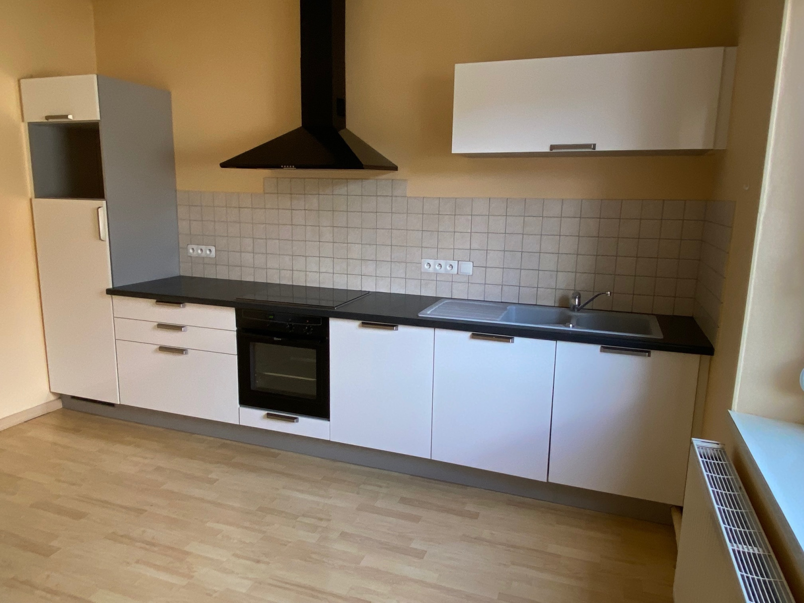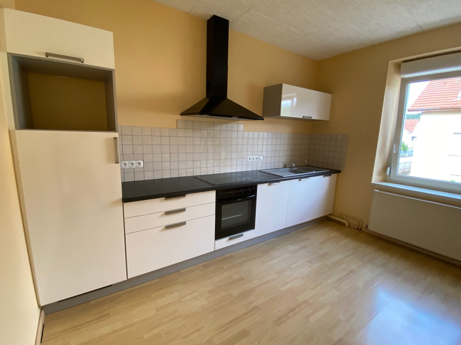 -au rez de chaussée sur-élévé : cuisine équipée de marque Schmidt avec lave vaisselle, plaque induction, réfrigérateur, hotte, four, salon
