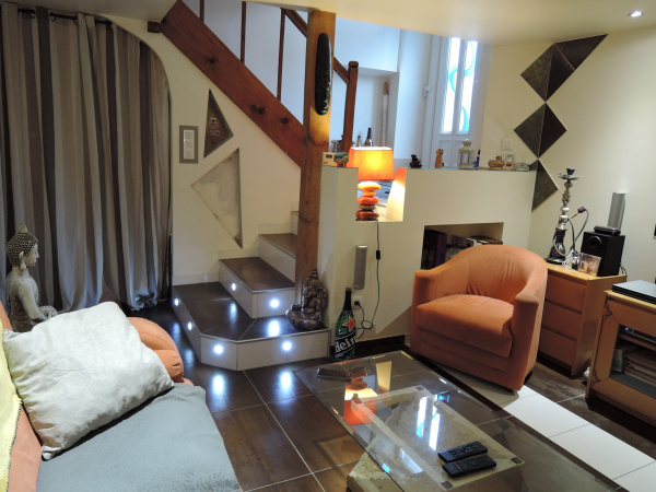 - en souplex : cave carrelée, salle d'eau, WC, couloir avec accès au garage