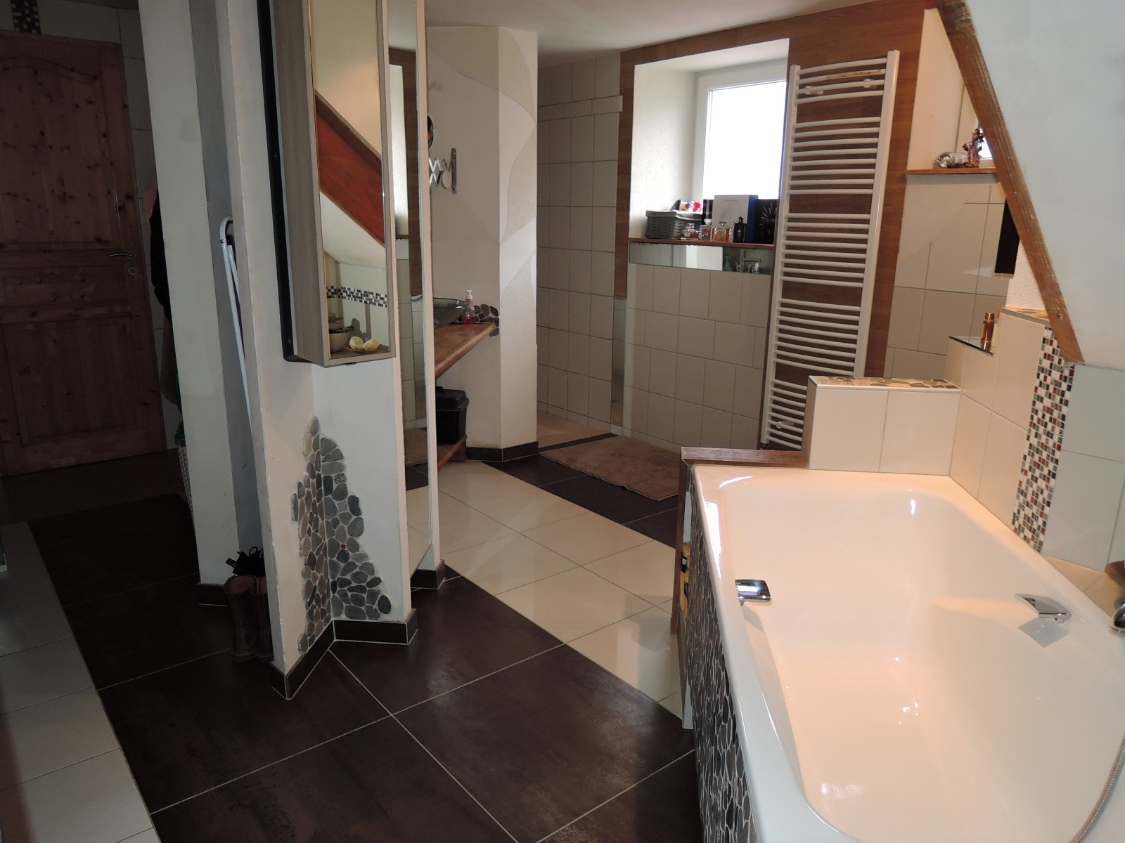- 1er niveau sur plancher chauffant: salon , salle de bain avec baignoire, douche italienne et WC , buanderie et accès sur le garage attenant.