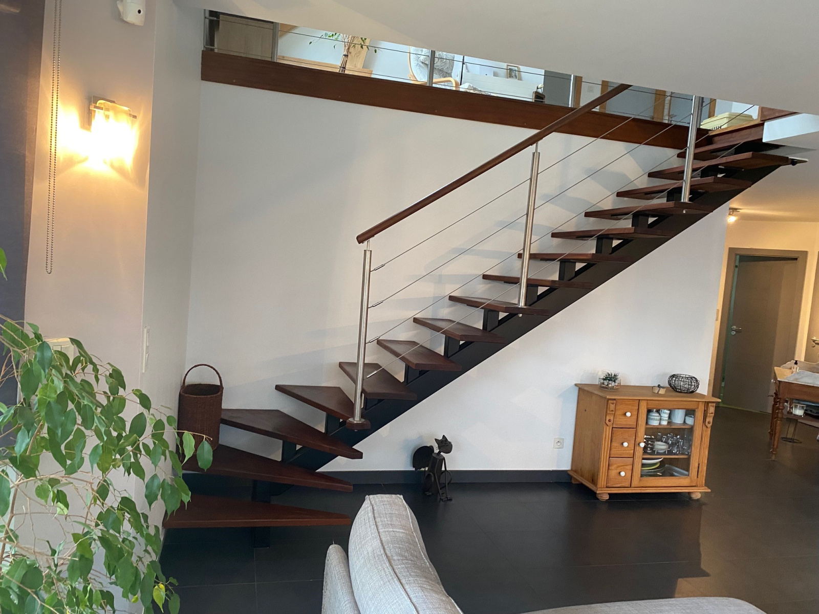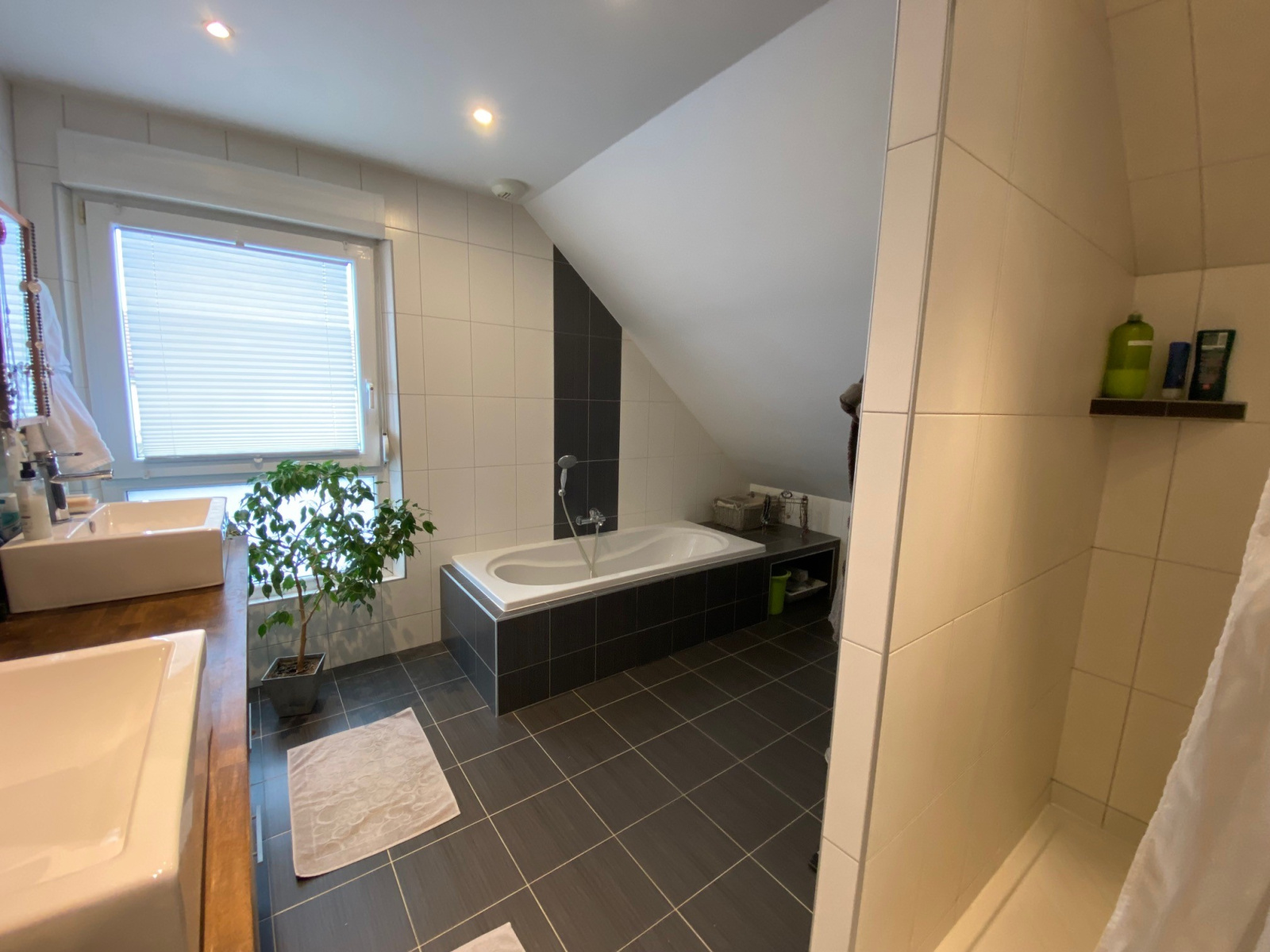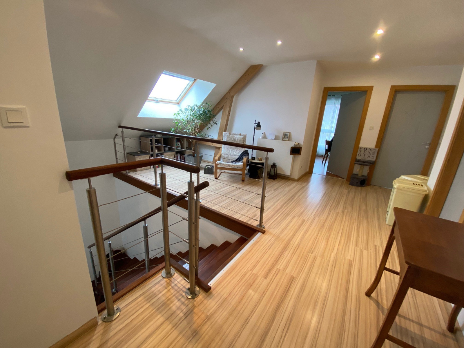 - accès à l'étage par un très bel escalier quart tournant au garde corps en inox : mézannine de 16 m2, 3 chambres de 12 à 16 m 2 avec leur coin dressing, salle de bain moderne avec baignoire, douche et meuble double vasque, coin buanderie. A noter la possibilité d''aménager un vaste espace supplémentaire au dessus du garage.
