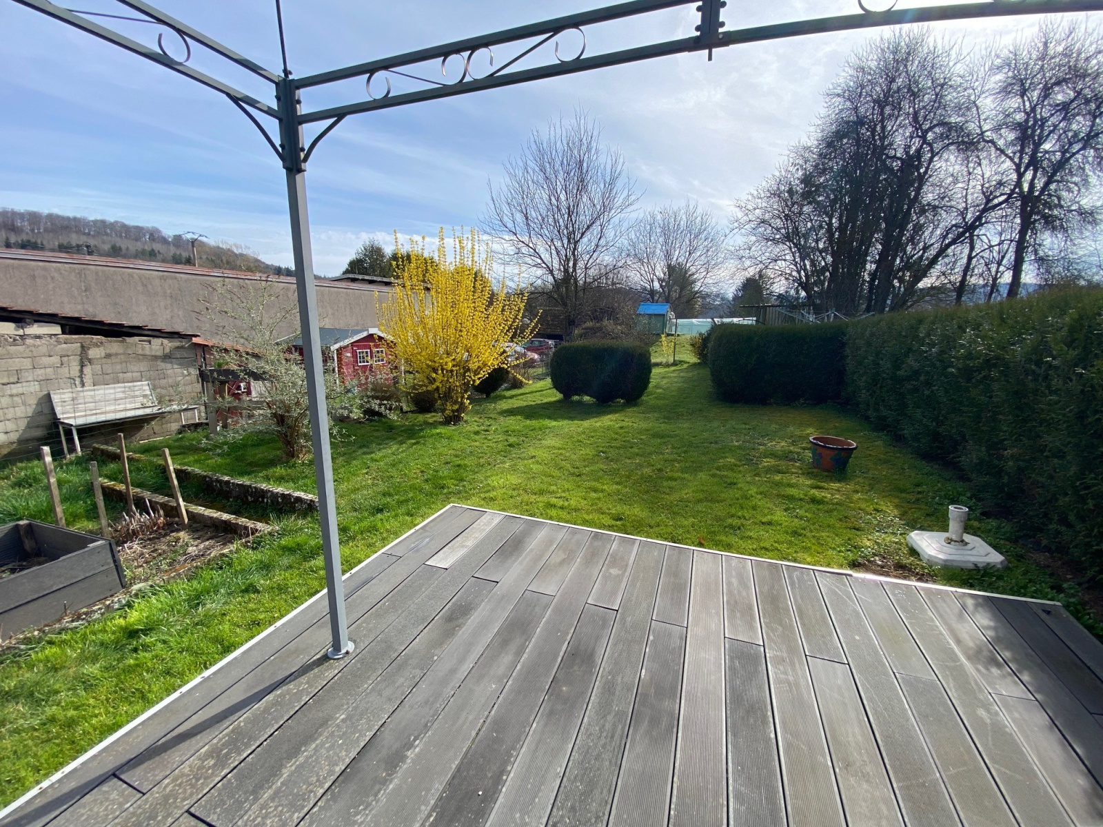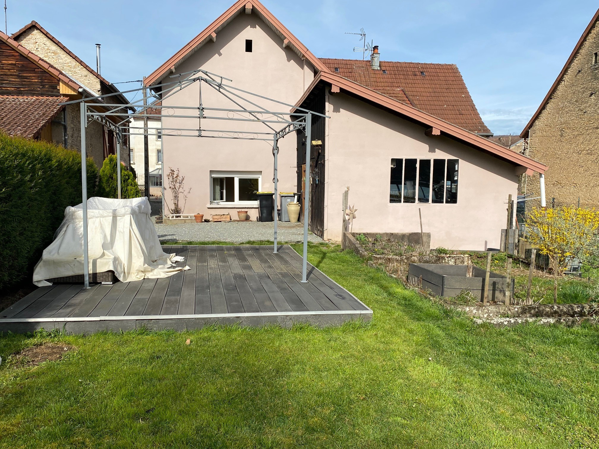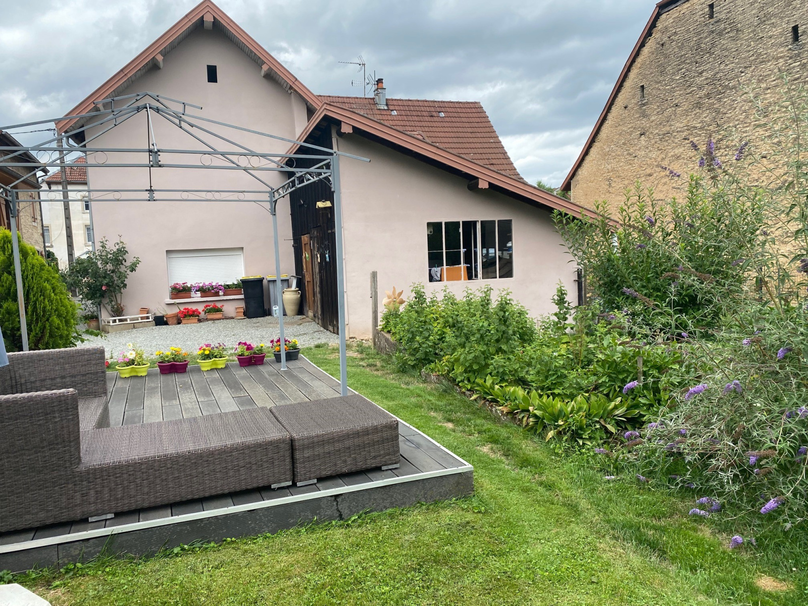 La maison est construite sur un joli terrain plat et engazonné .. Une grange faisant office de garage est accolée à la maison.