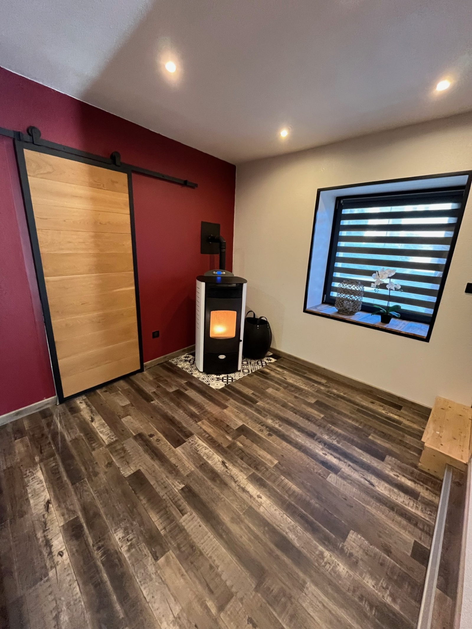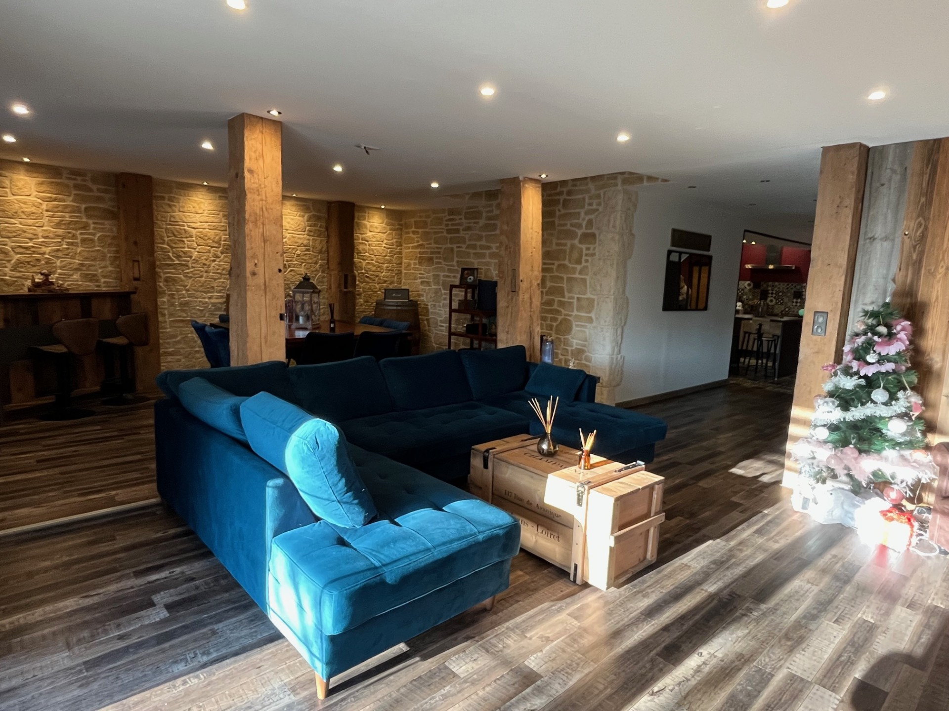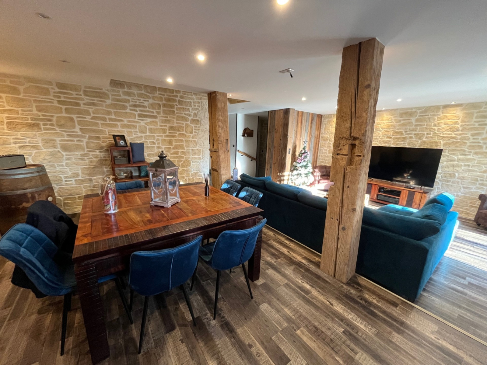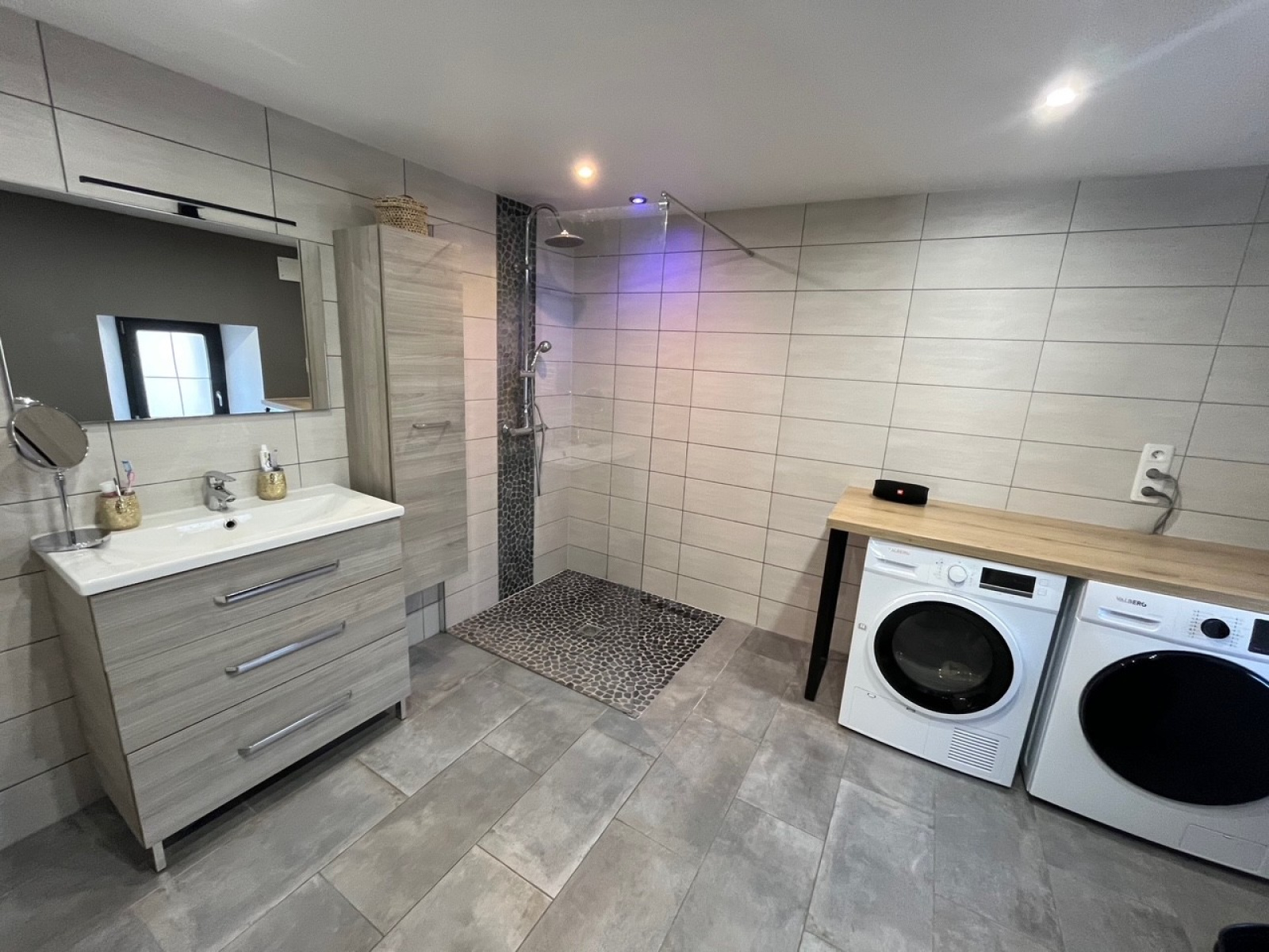 - au rez de chaussée : entreé de plain pied, vaste espace de vie composé d'une cuisine équipée moderne ouverte sur salon et salle à manger avec accès à l'extérieur depuis la cuisine et le salon, salle d'eau-buanderie, cellier permettant de rejoindre une ancienne grange faisant office de garage et espace atelier .