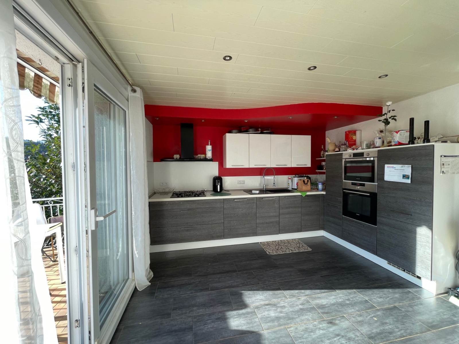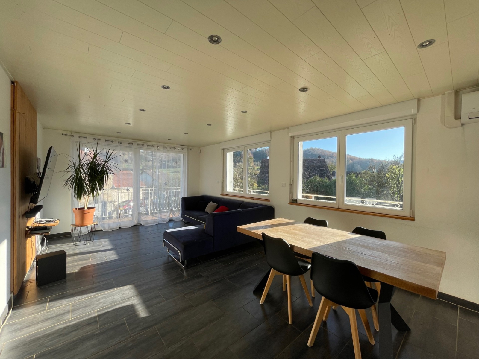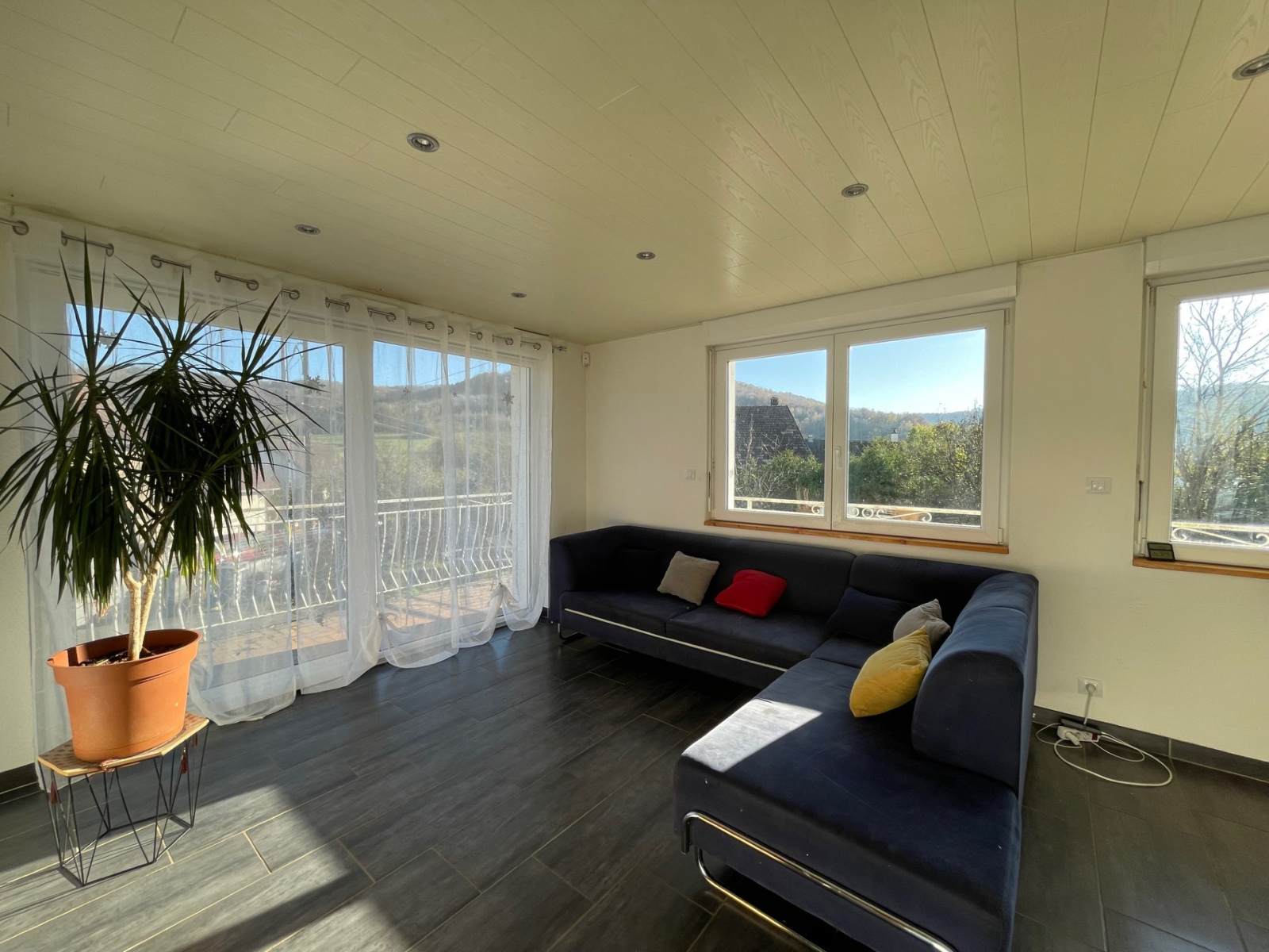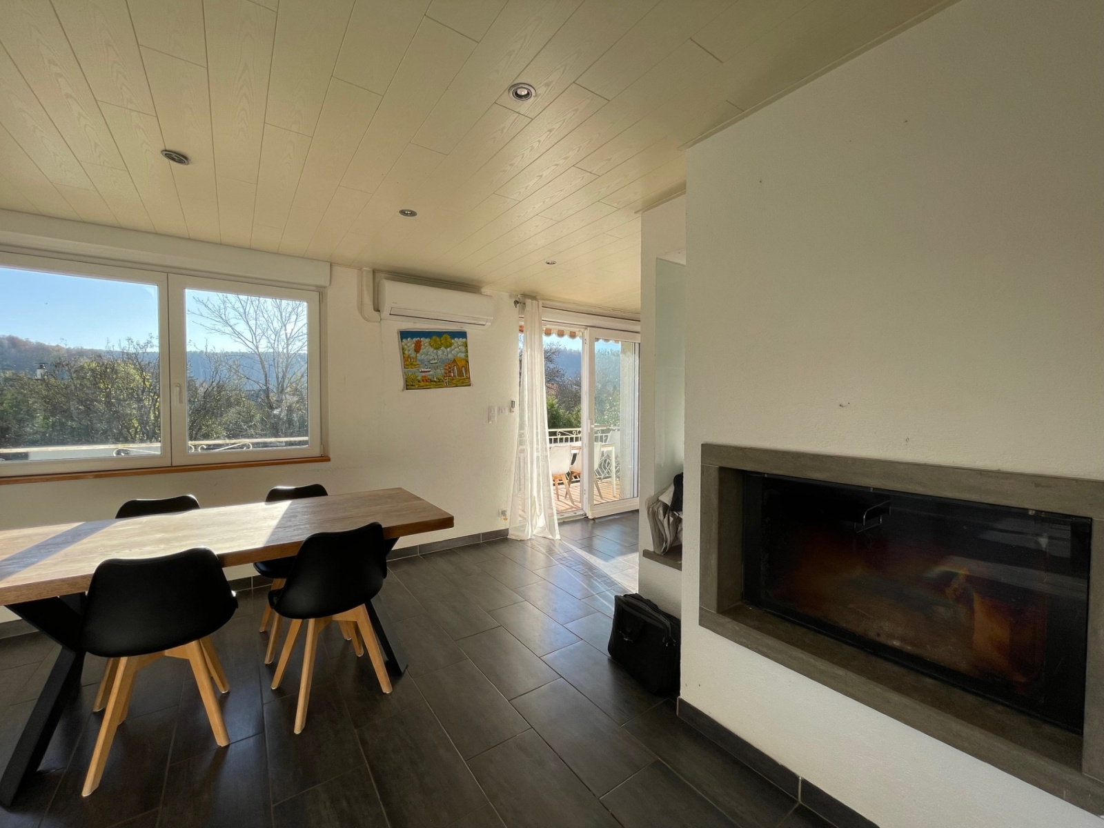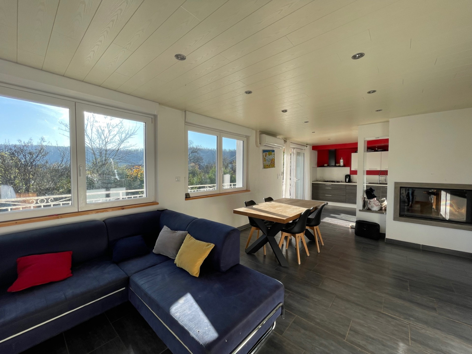 La vaste pièce de vie bénéficie d'une cheminée et d'une très grande luminosité grâce à ses deux baies vitrées permettant un double accès au balcon .