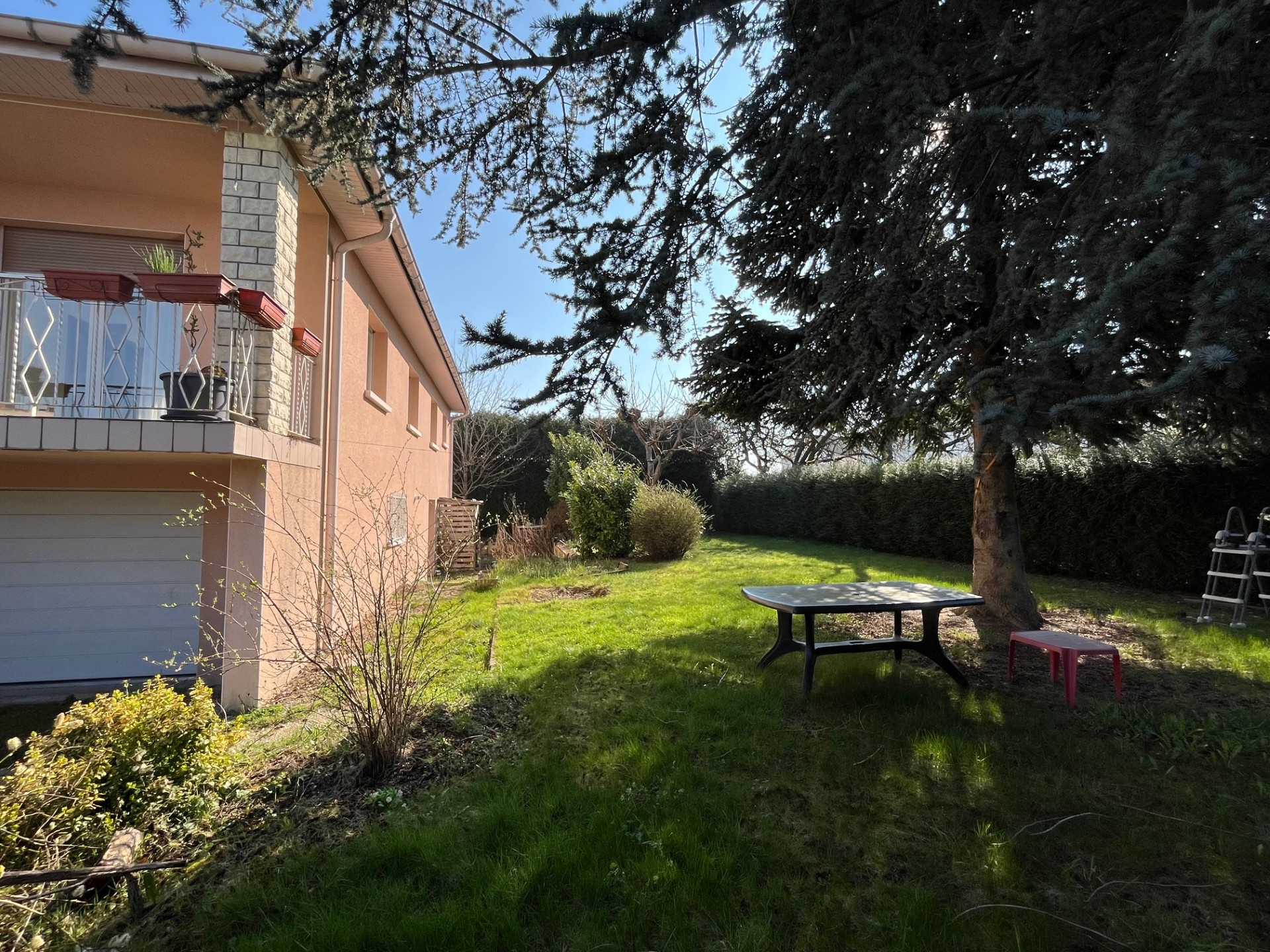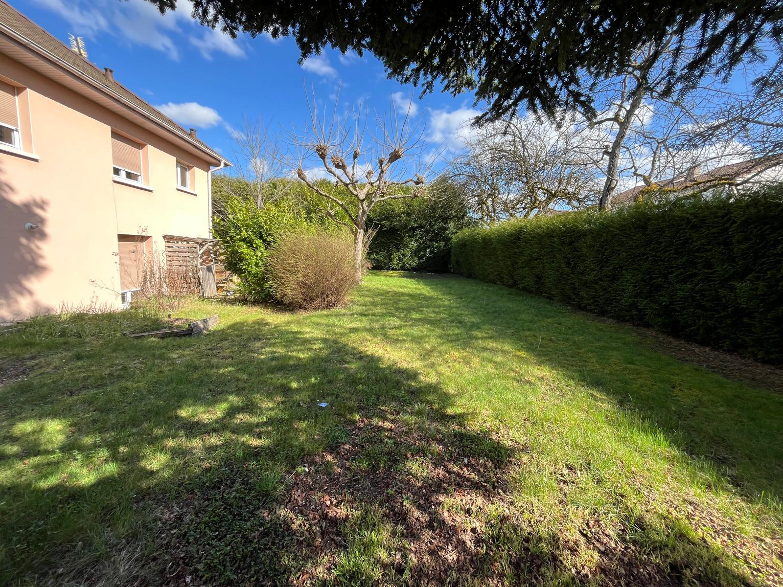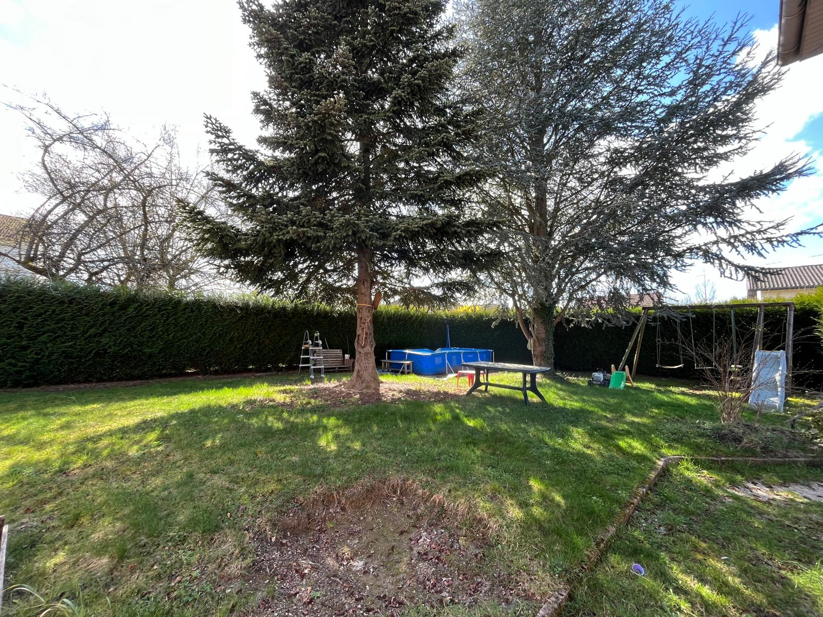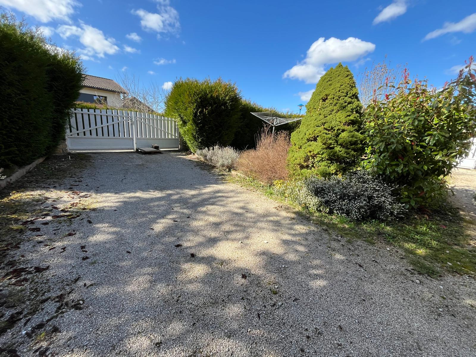 Terrain plat, clos et arboré de 10.03 ares : double portail, 2 places de parking intérieures, joli jardin engazonné.