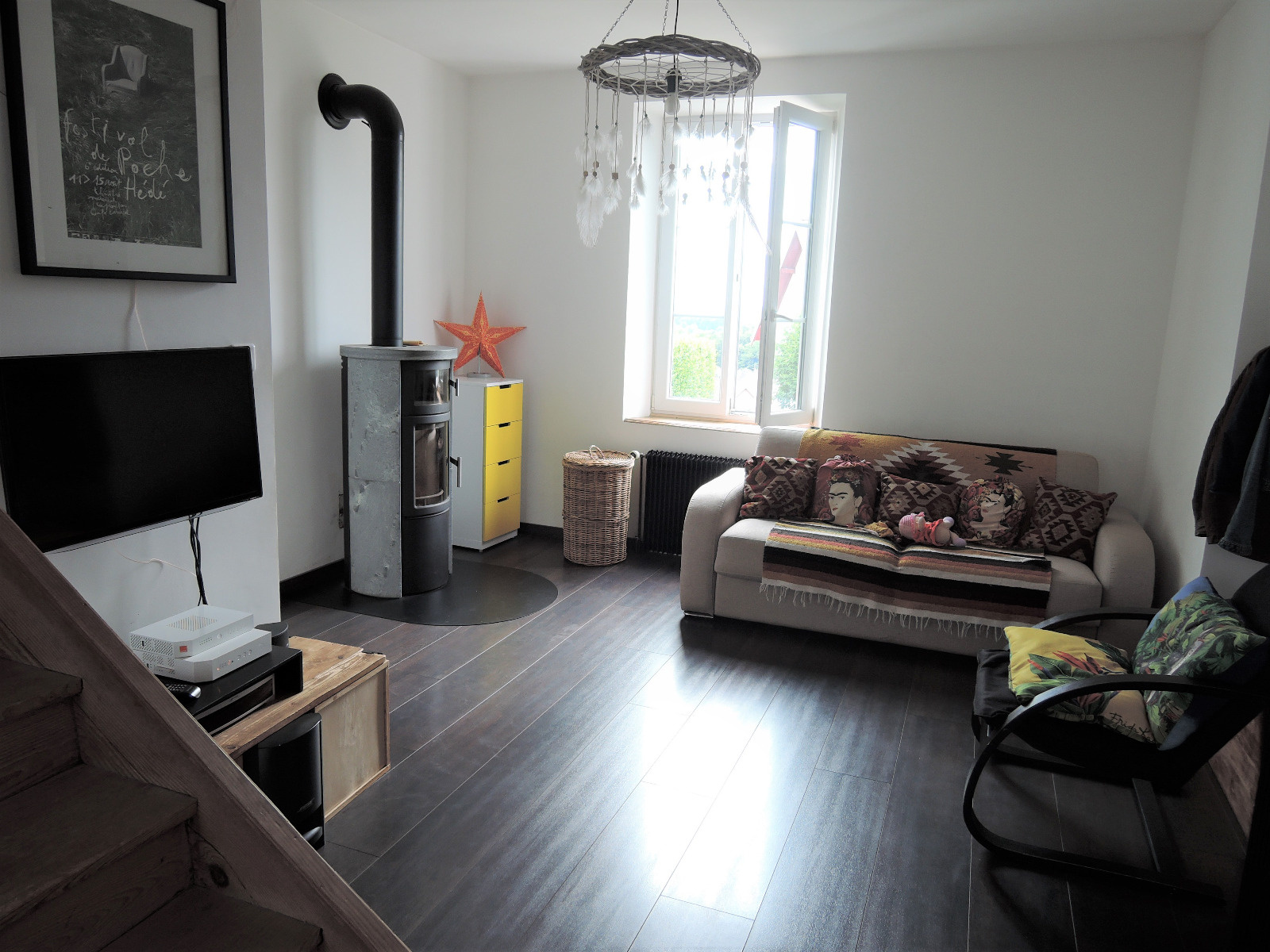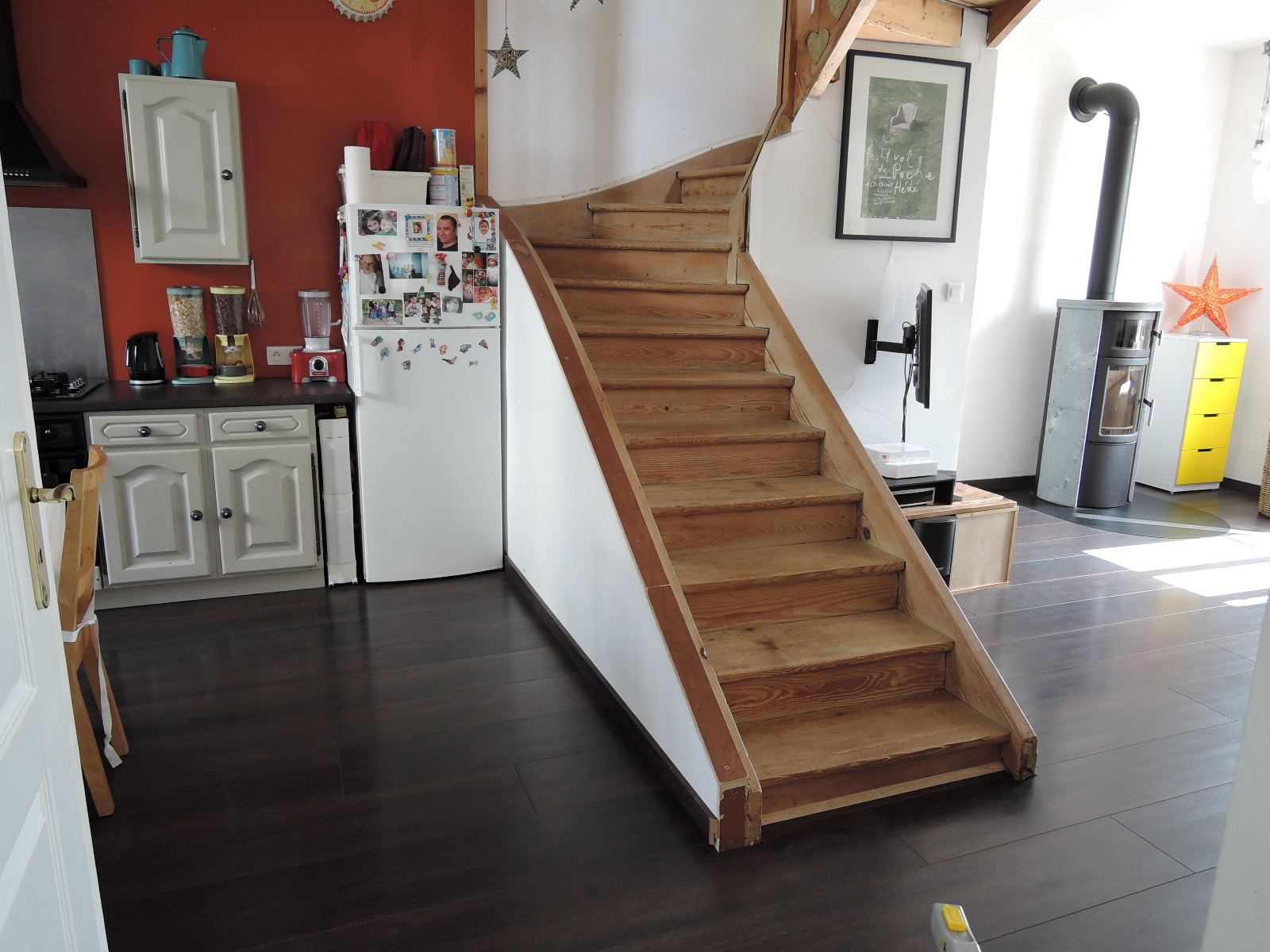 De plain pied: une extension permet de bénéficier d'une grande entrée avec de nombreux rangements et un bureau, une pièce de vie alliant cuisine équipée et salon avec parquet et poêle à bois, un WC séparé.