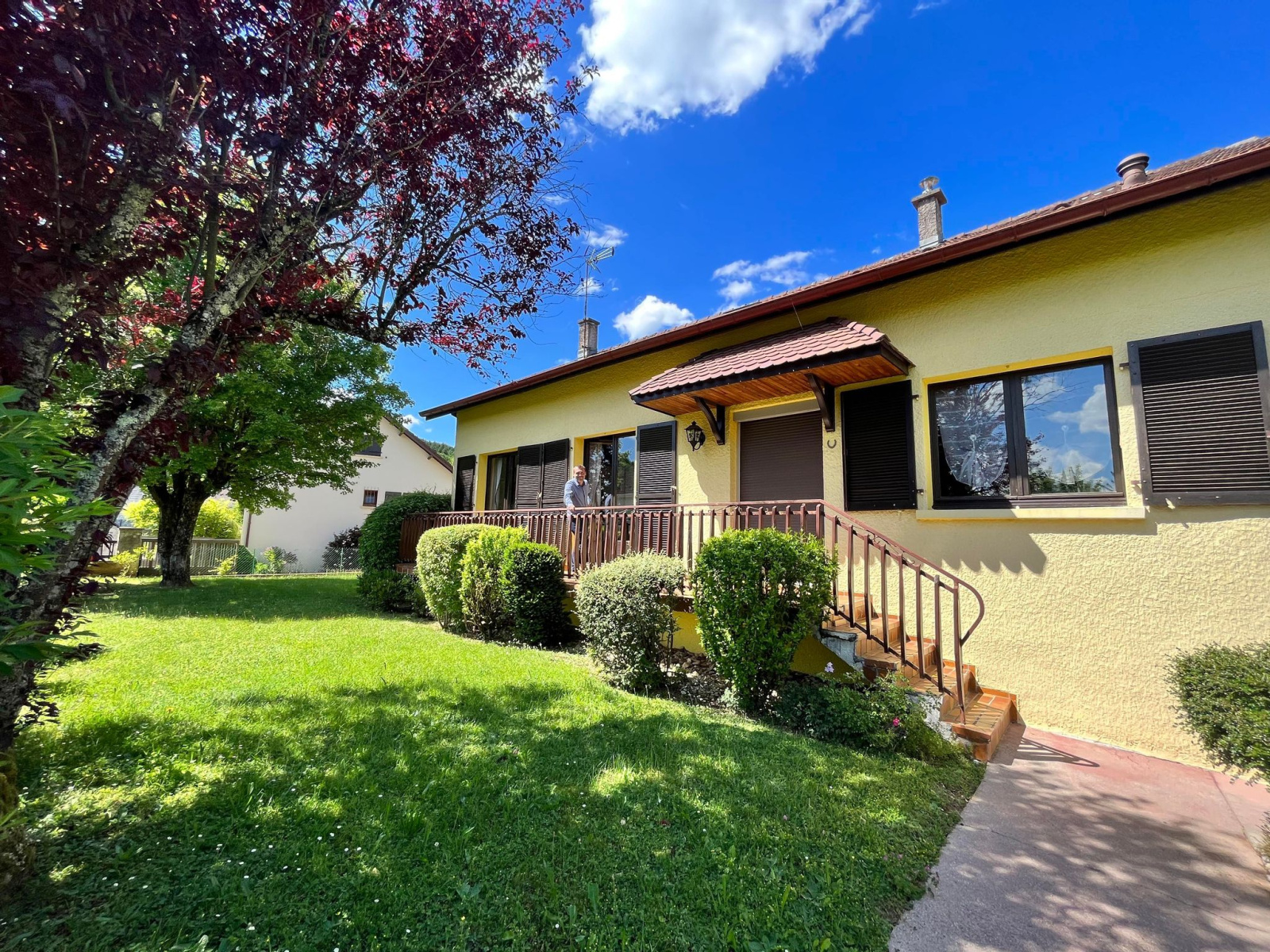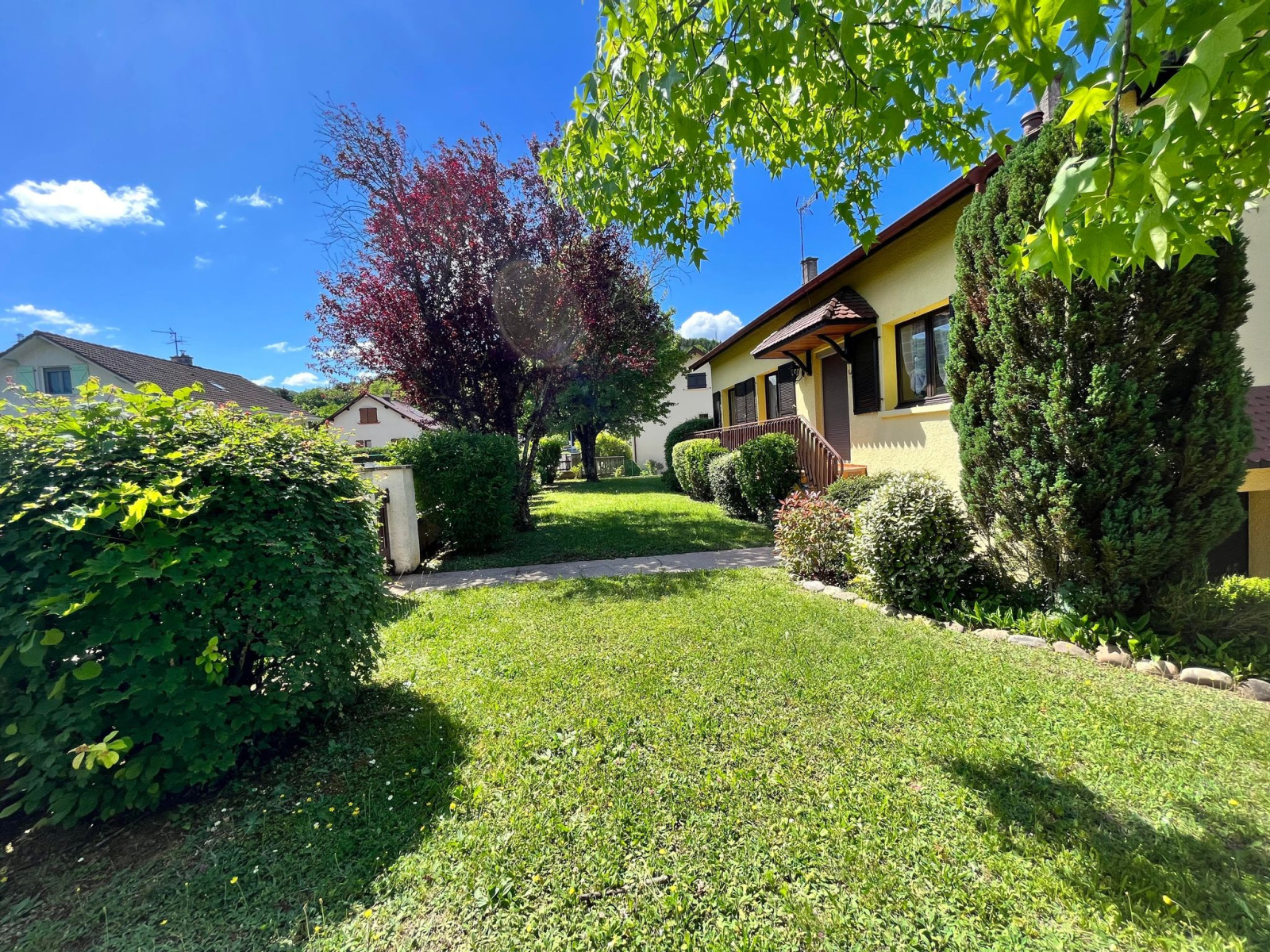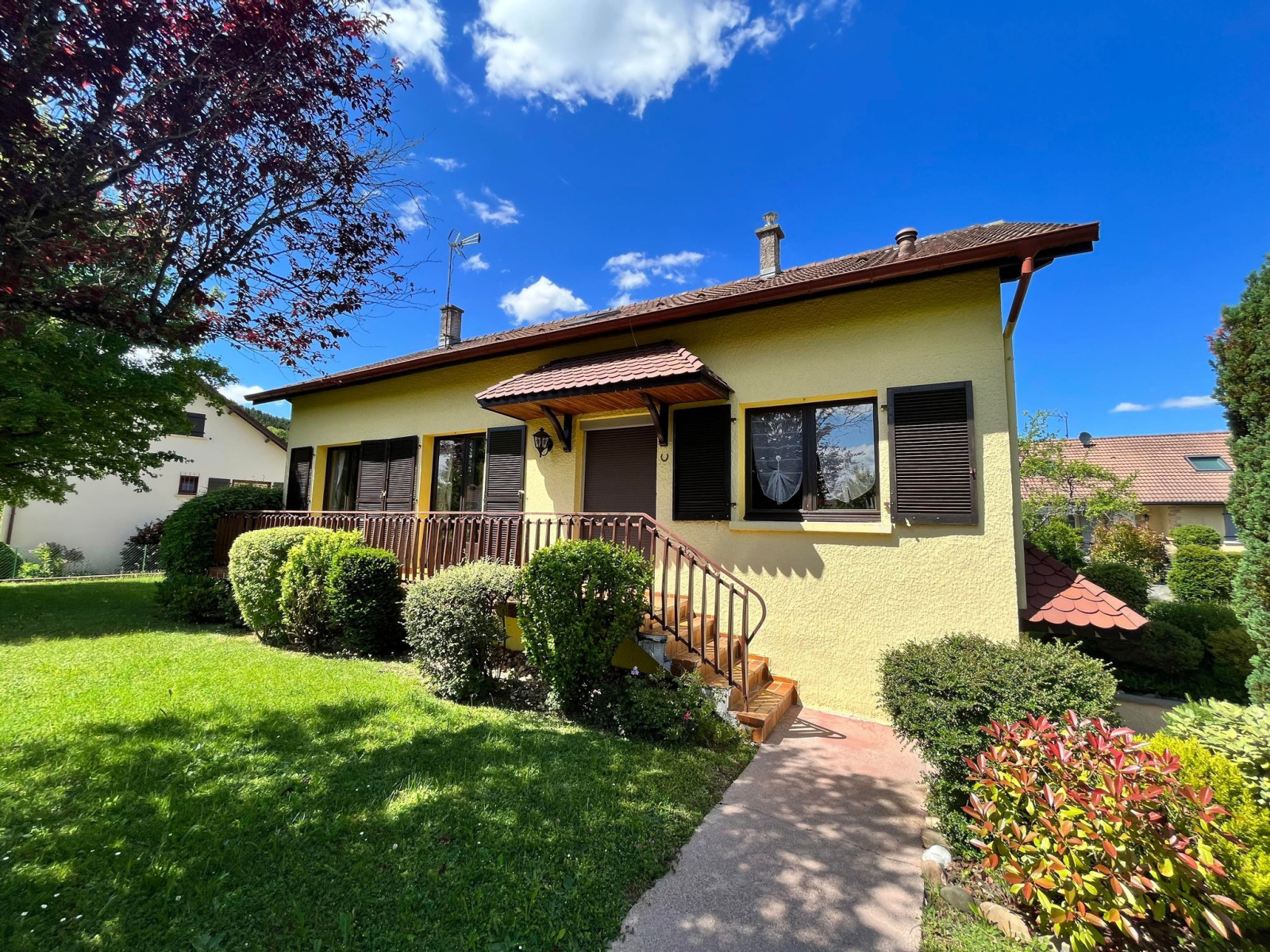 Notre agence vous propose en exclusivité à Mathay, située dans une impasse, une maison de 1980 érigée sur un terrain plat et clos et paysager de plus de 7 ares.