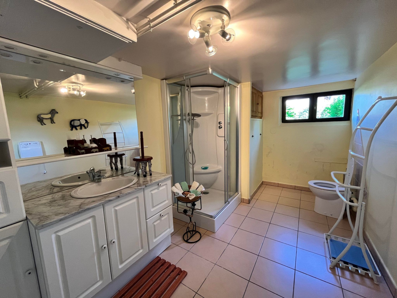 Le sous-sol a été aménagé avec une pièce pouvant faire office de chambre, ainsi qu'une salle d'eau. Le garage pouvant accueillir 2 voitures, est carrelé.