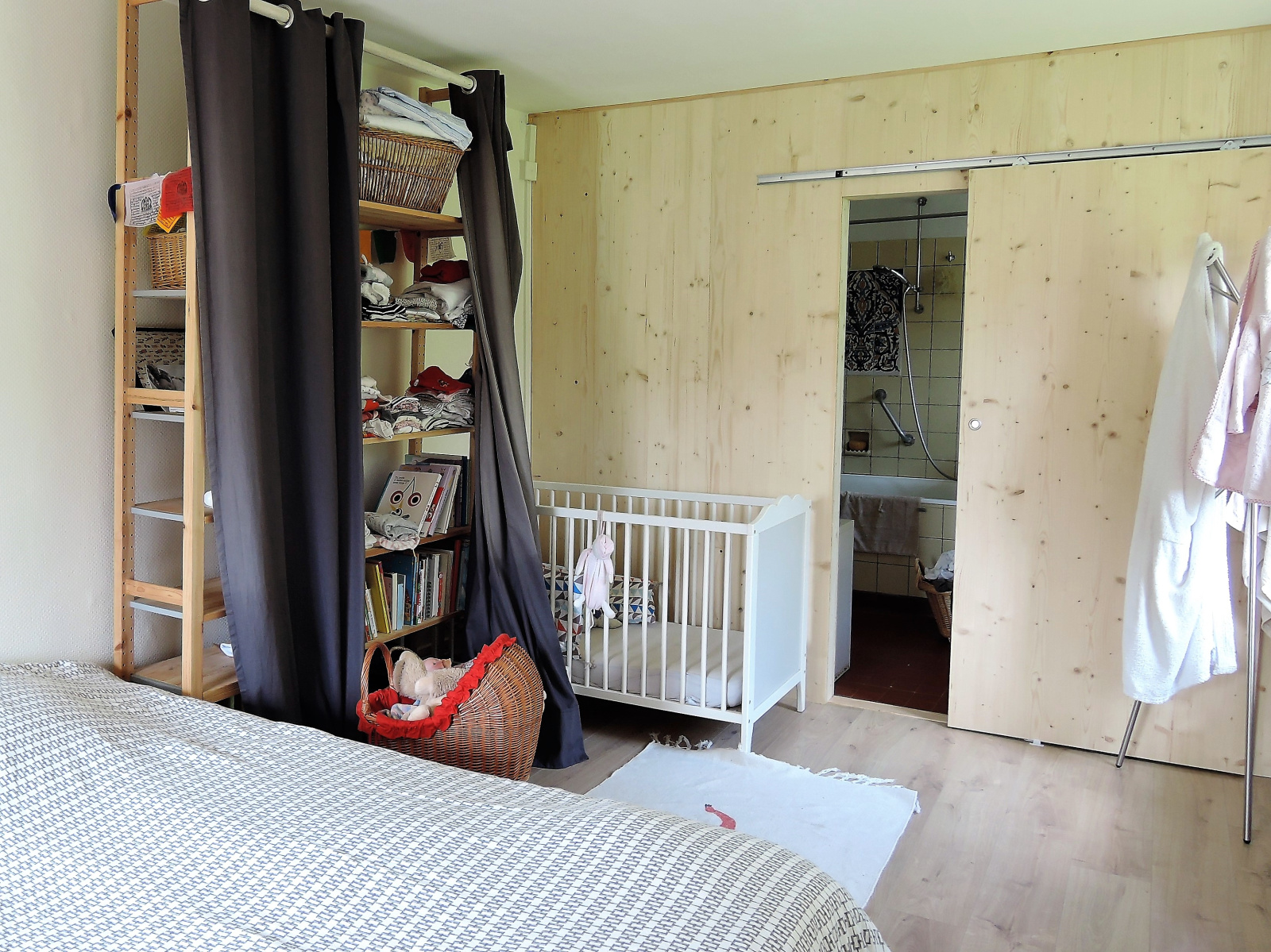 Attenant à cette grange, une cuisine aménagée en 2018, un séjour lumineux avec parquet et poële à bois et une seconde chambre avec salle de bain.