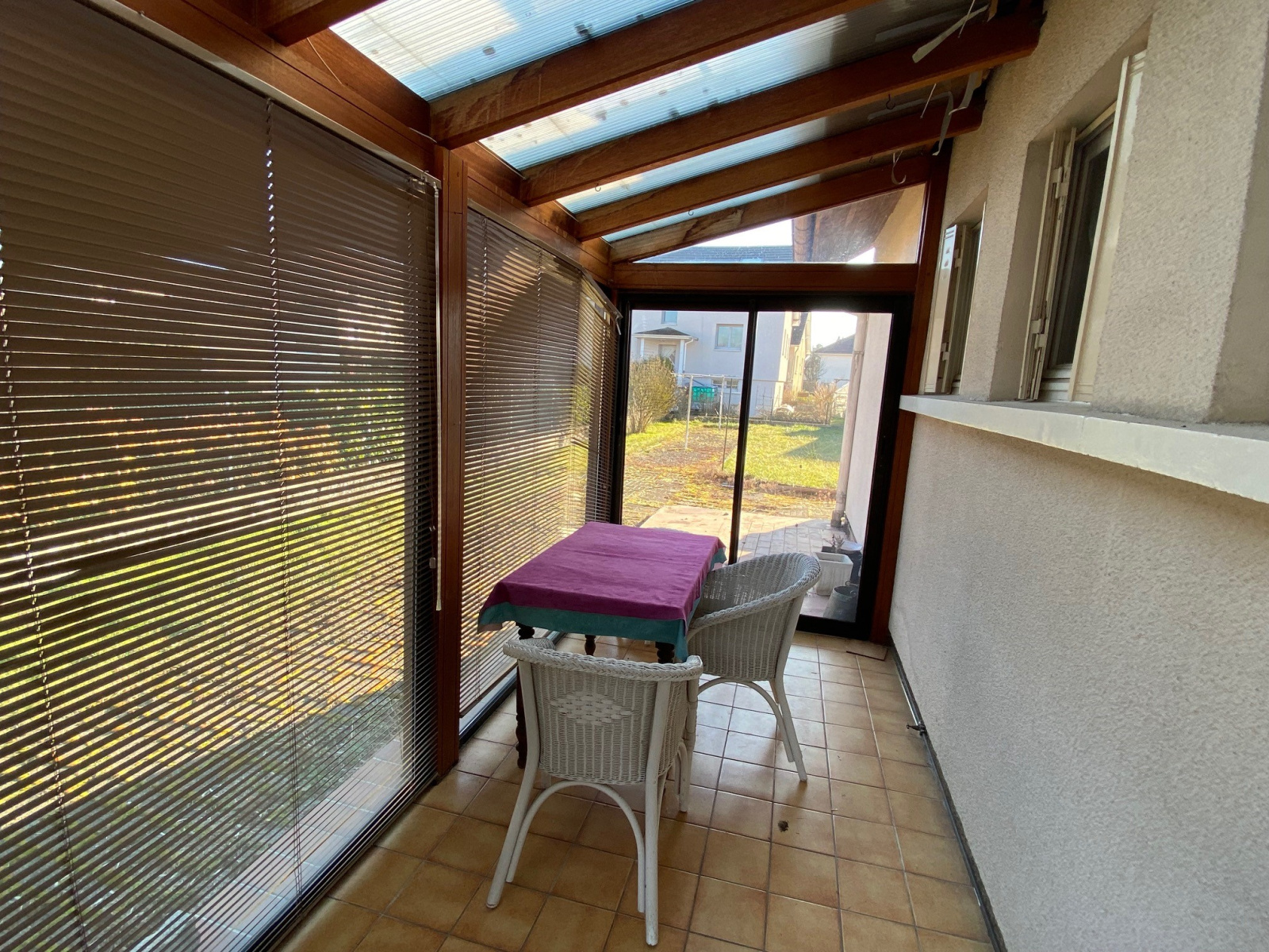 entrée par véranda, séjour de plus de 20 m² avec accès direct à l’extérieur, 3 chambres, une buanderie donnant accès à une salle de bain, un salon, une petite cuisine séparée semi-équipée et un garage avec possibilité de rangements.
