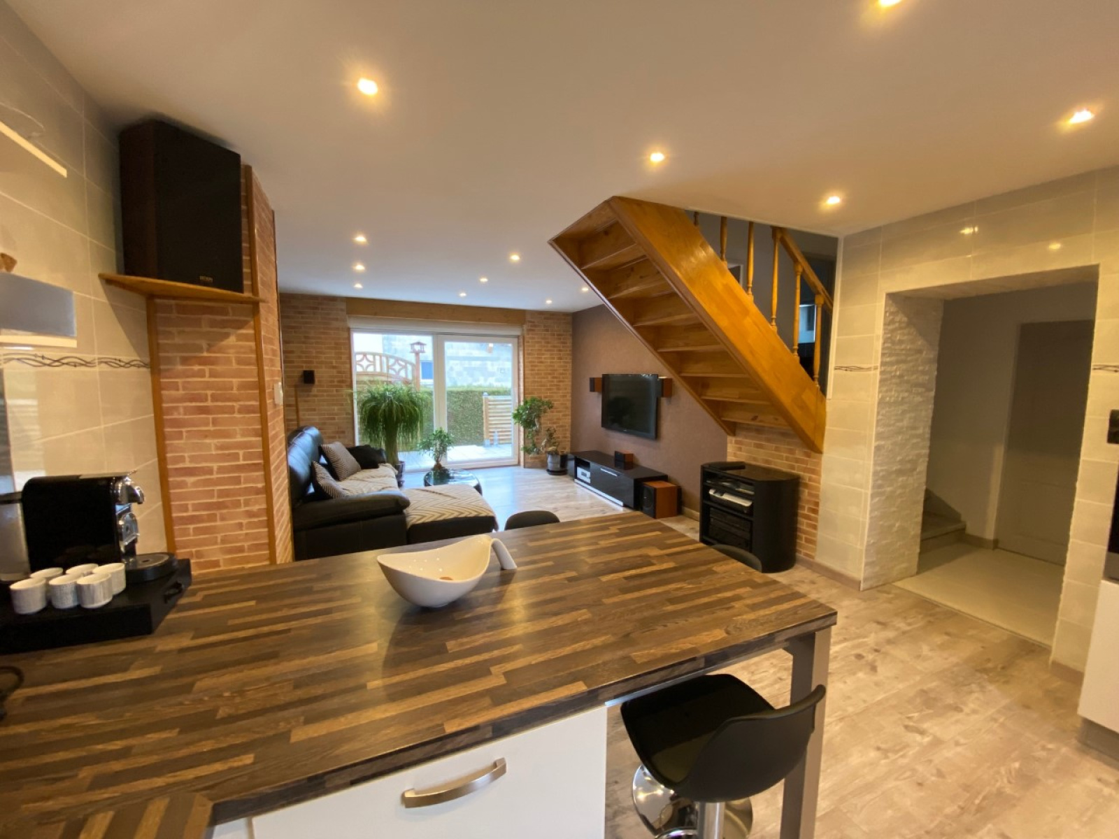 - Au rez-de-chaussée surélévé : sas d'entrée, bel espace de vie composé d'une cuisine équipée récente (CUISINELLA) et d'un salon avec accès direct à la terrasse exposée sud-ouest, WC.