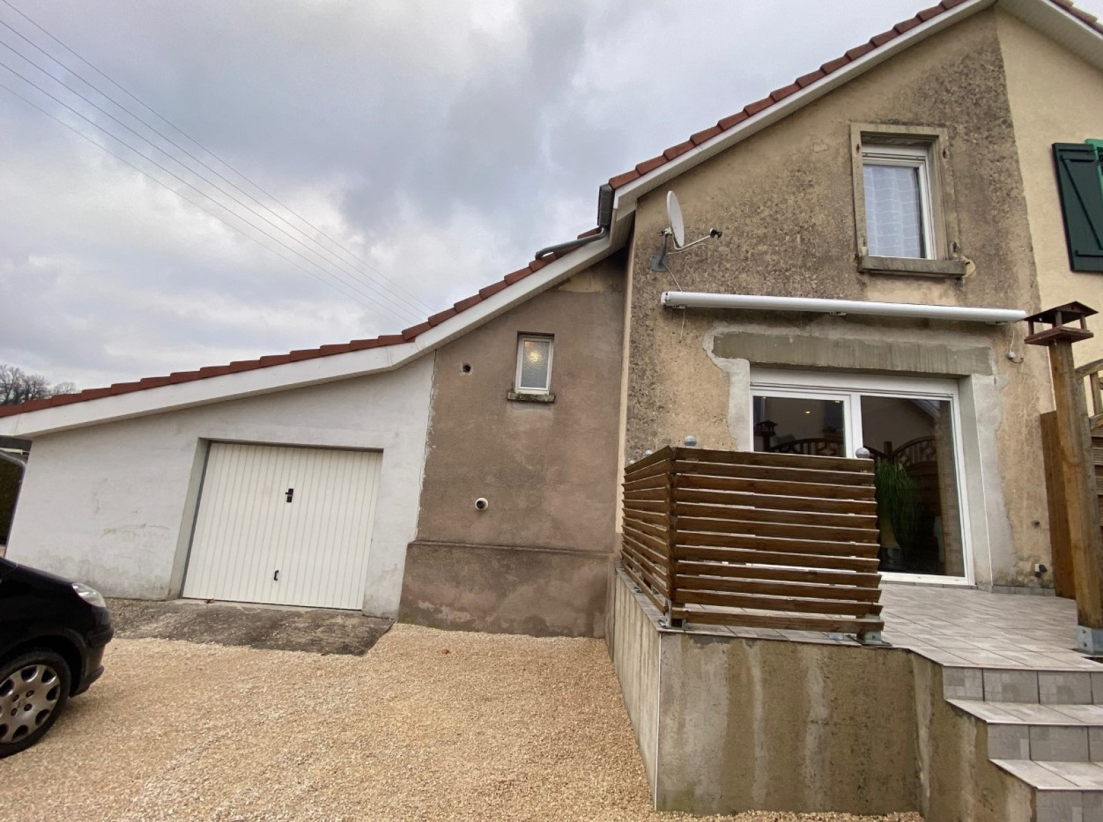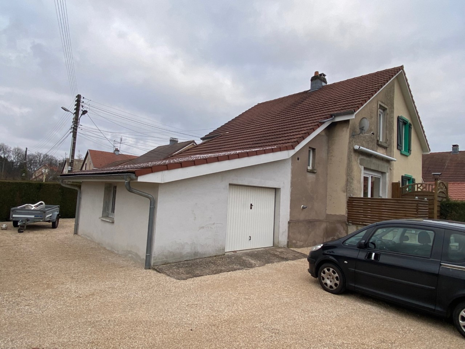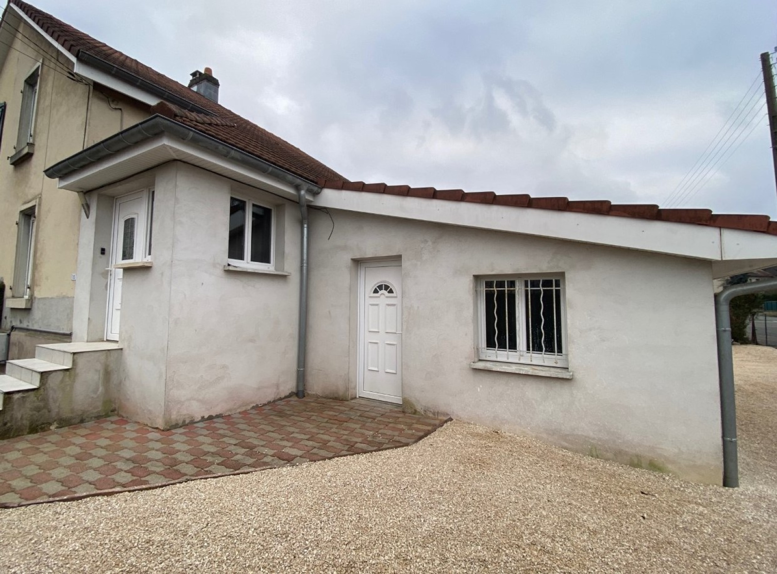 A l'extérieur, une allée pavée mène à l'entrée, une cour en gravier permet de stationner plusieurs véhicules et la terrase dallée est de plain pied avec le salon.