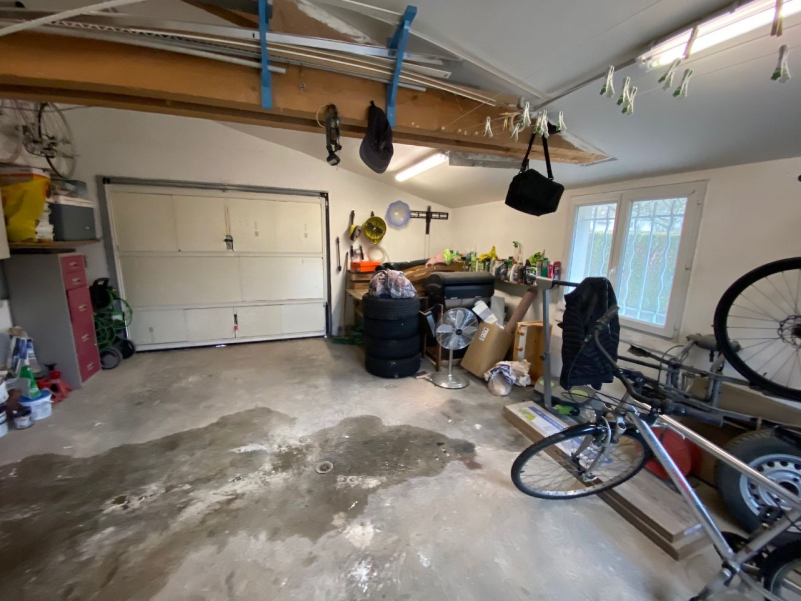 Garage récent de 30 m² attenant à la maison et donnant accès à la cave.