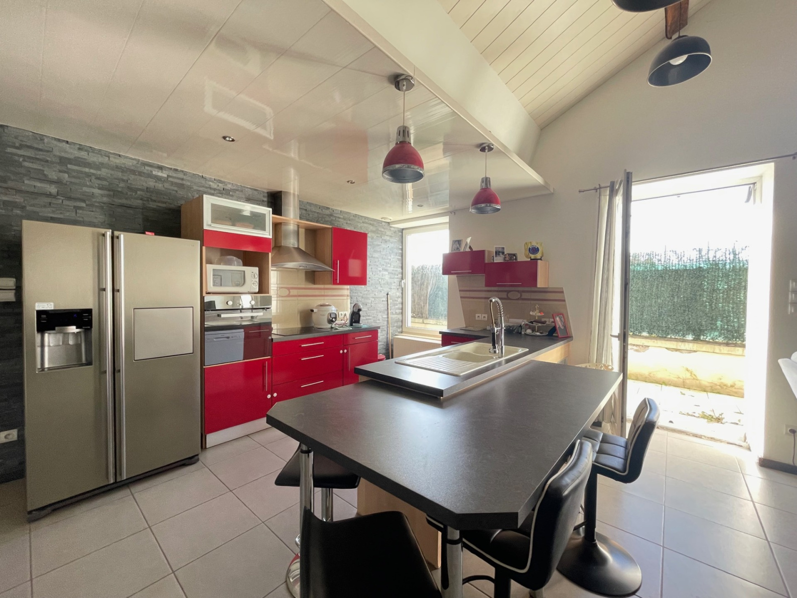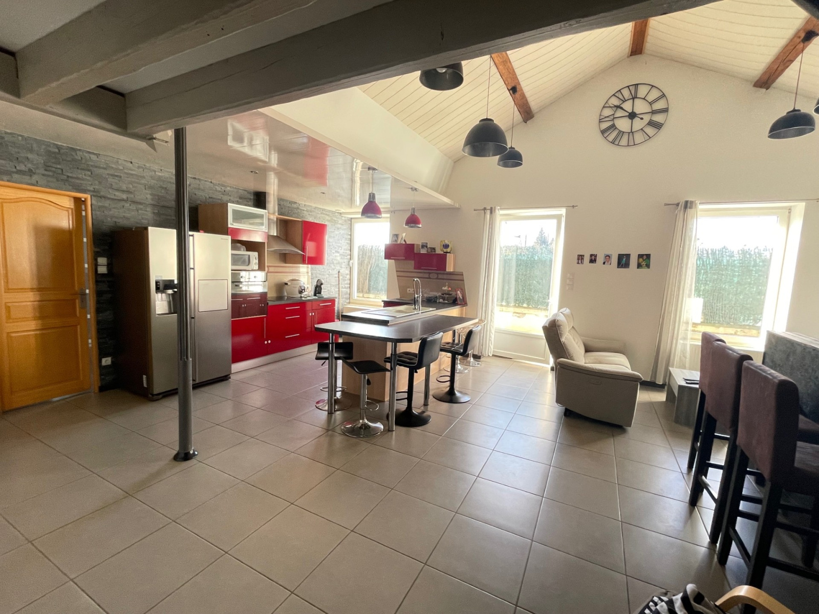La pièce-de-vie aux volumes généreux grace au plafond cathédrale comprend une cuisine équipée ouverte sur le salon . Elle bénéficie d'un extérieur privé.
