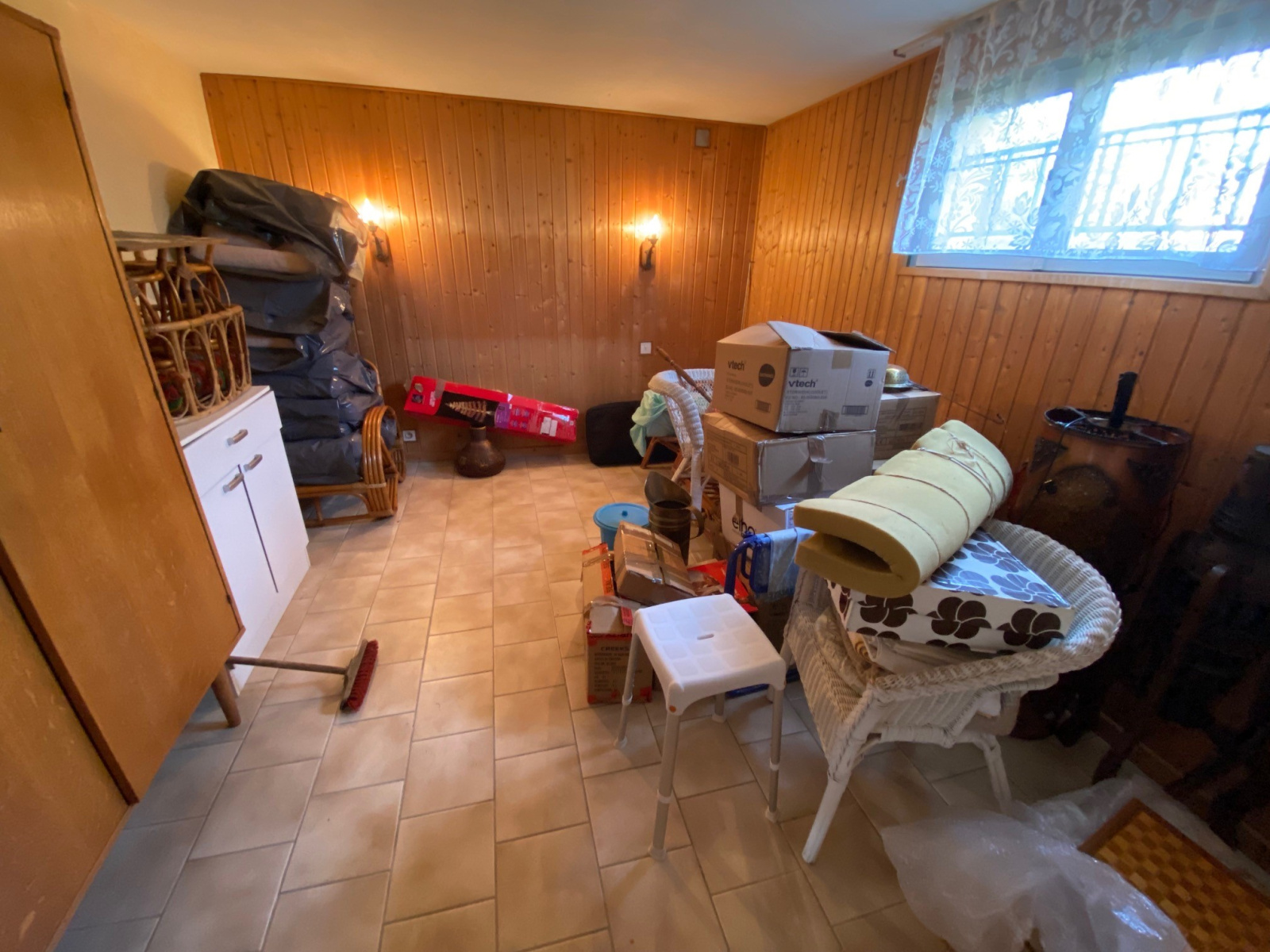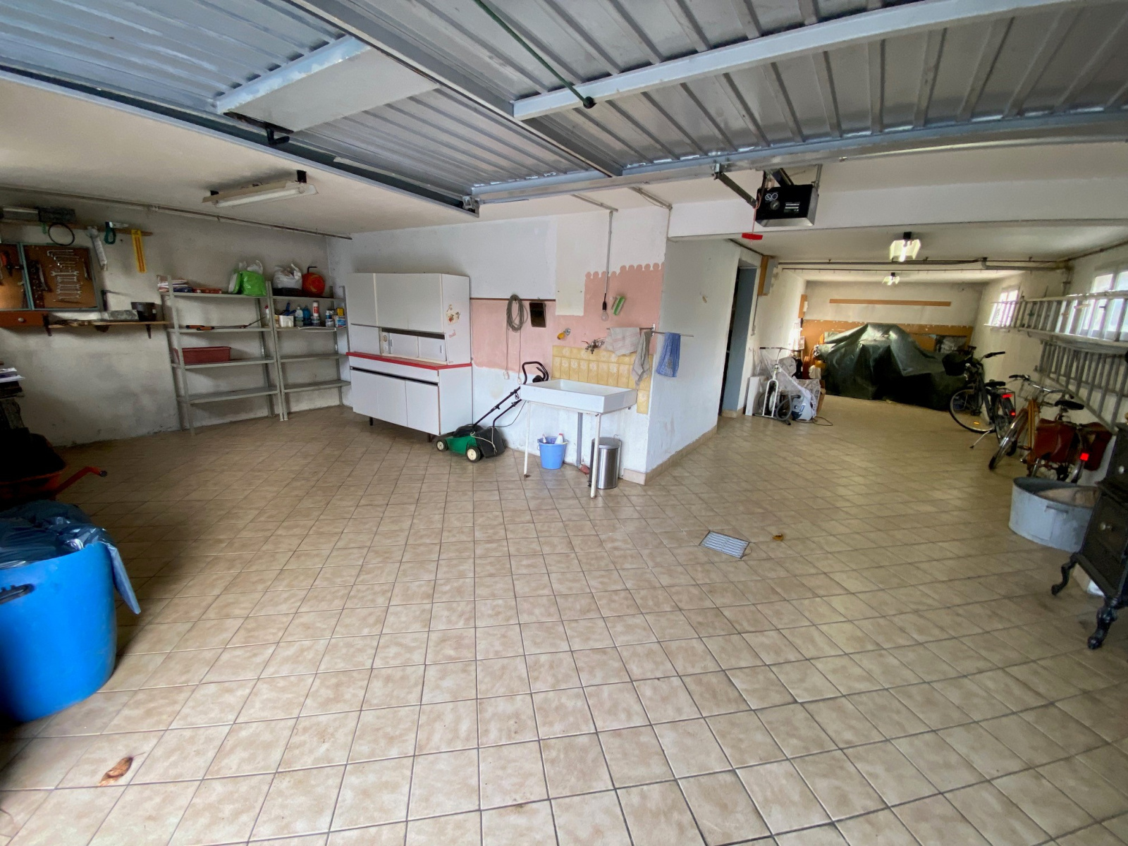 Le sous-sol carrelé complet de plain-pied comprend un garage deux voitures avec porte motorisée, un coin atelier, chaufferie-buanderie-WC, une cave, une pièce pouvant faire office de troisième chambre ou bureau.