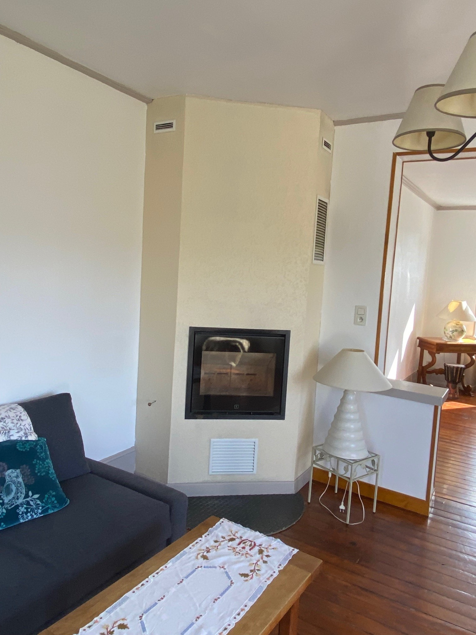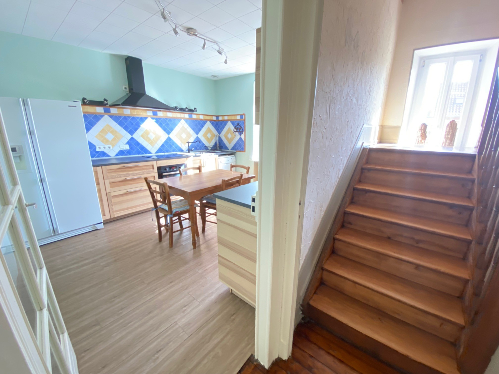 - au rez de chaussée sur-élevé : dégagement, salon salle à manger avec cheminée créee en 2014, salle d'eau, une chambre de 13 m2, cuisine équipée datant de 2020.
