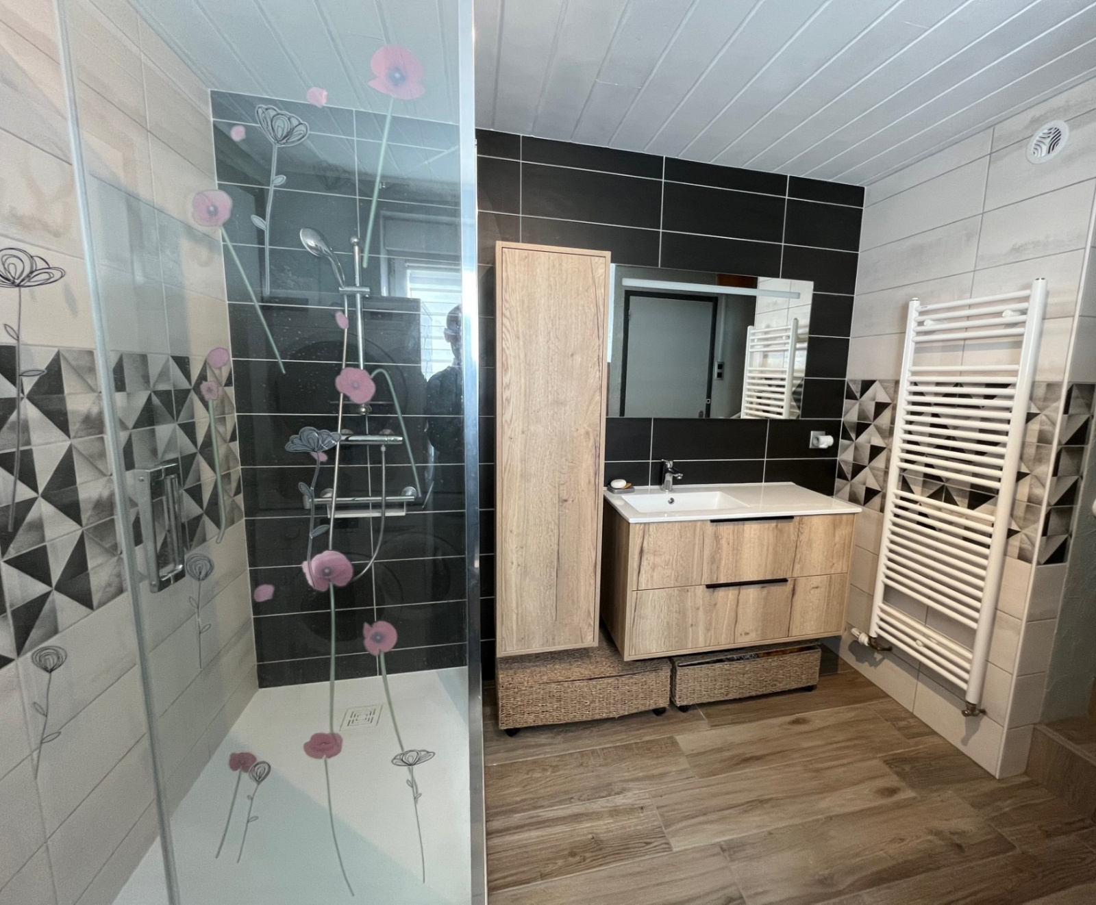 - en demi niveau inférieur, salle d'eau rénovée 2021, cellier et garage