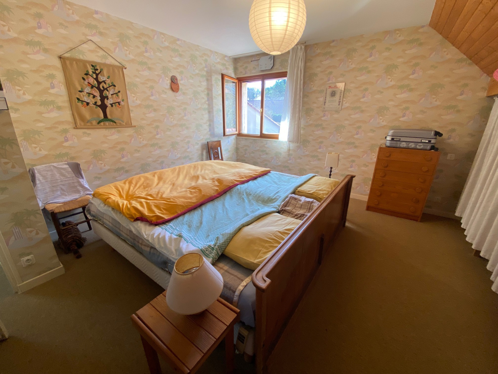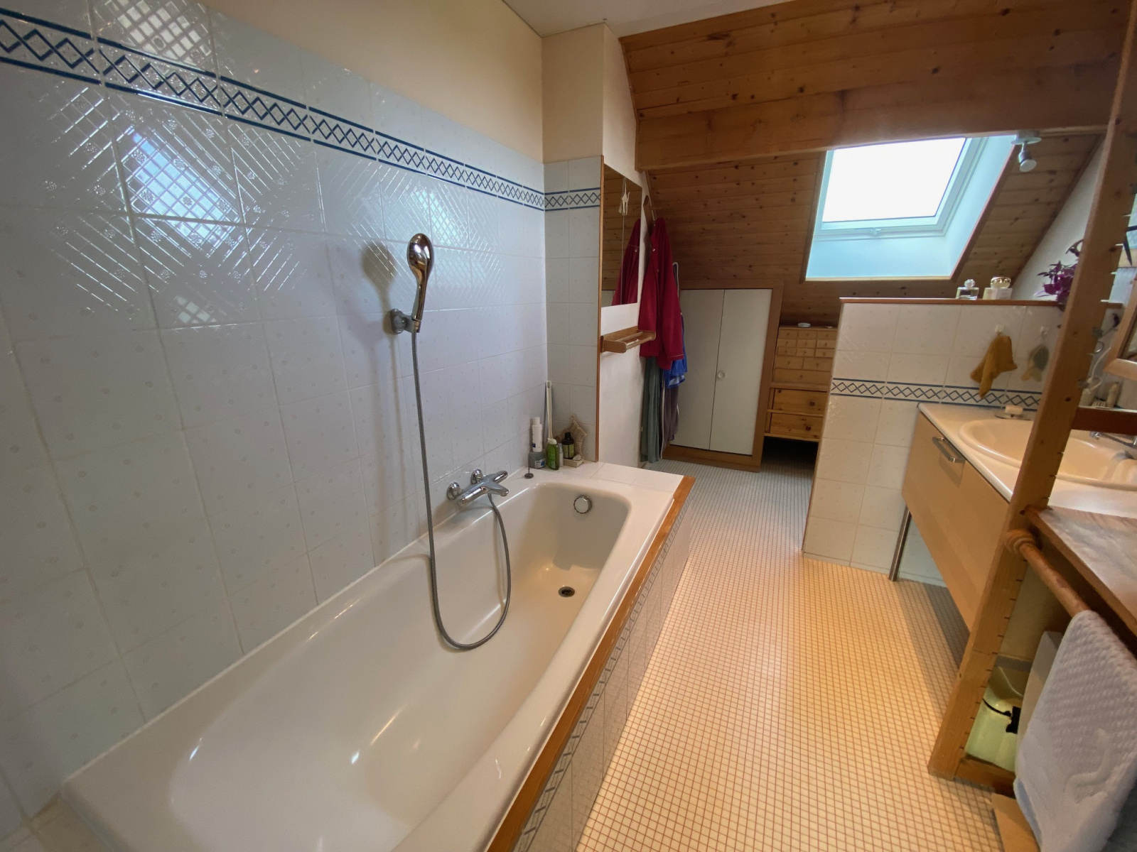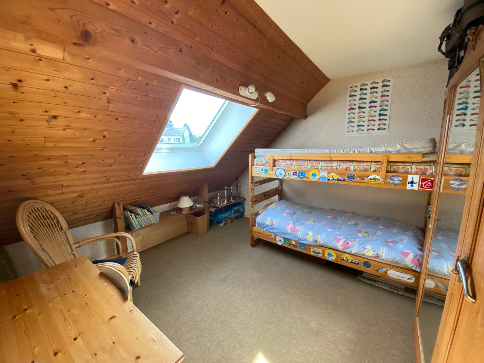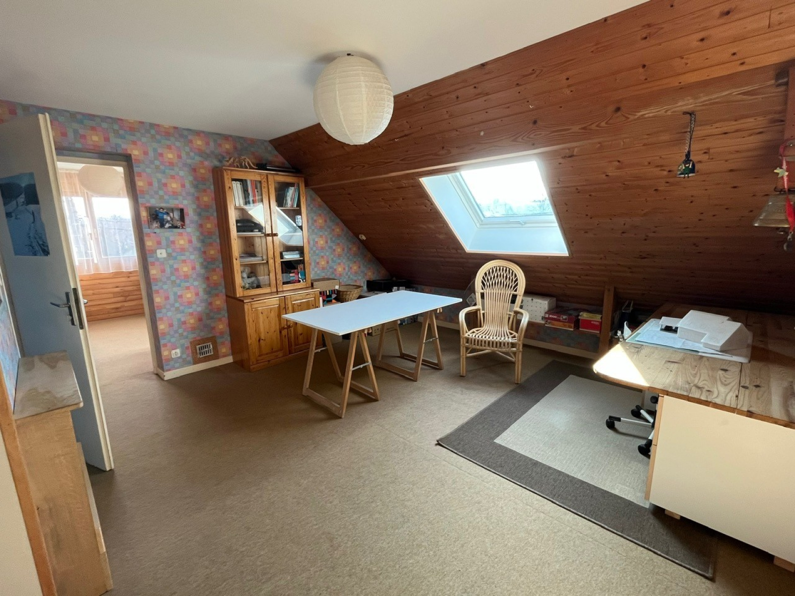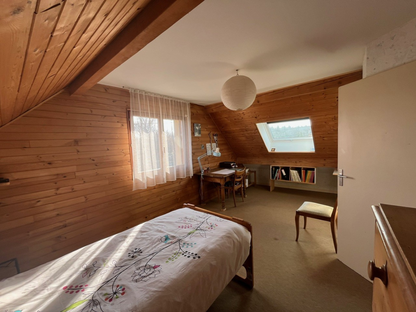 - à l'étage : mézzanine aménagée en bureau-bibliothèque, 3 chambres, une salle de bains avec WC, accès combles.