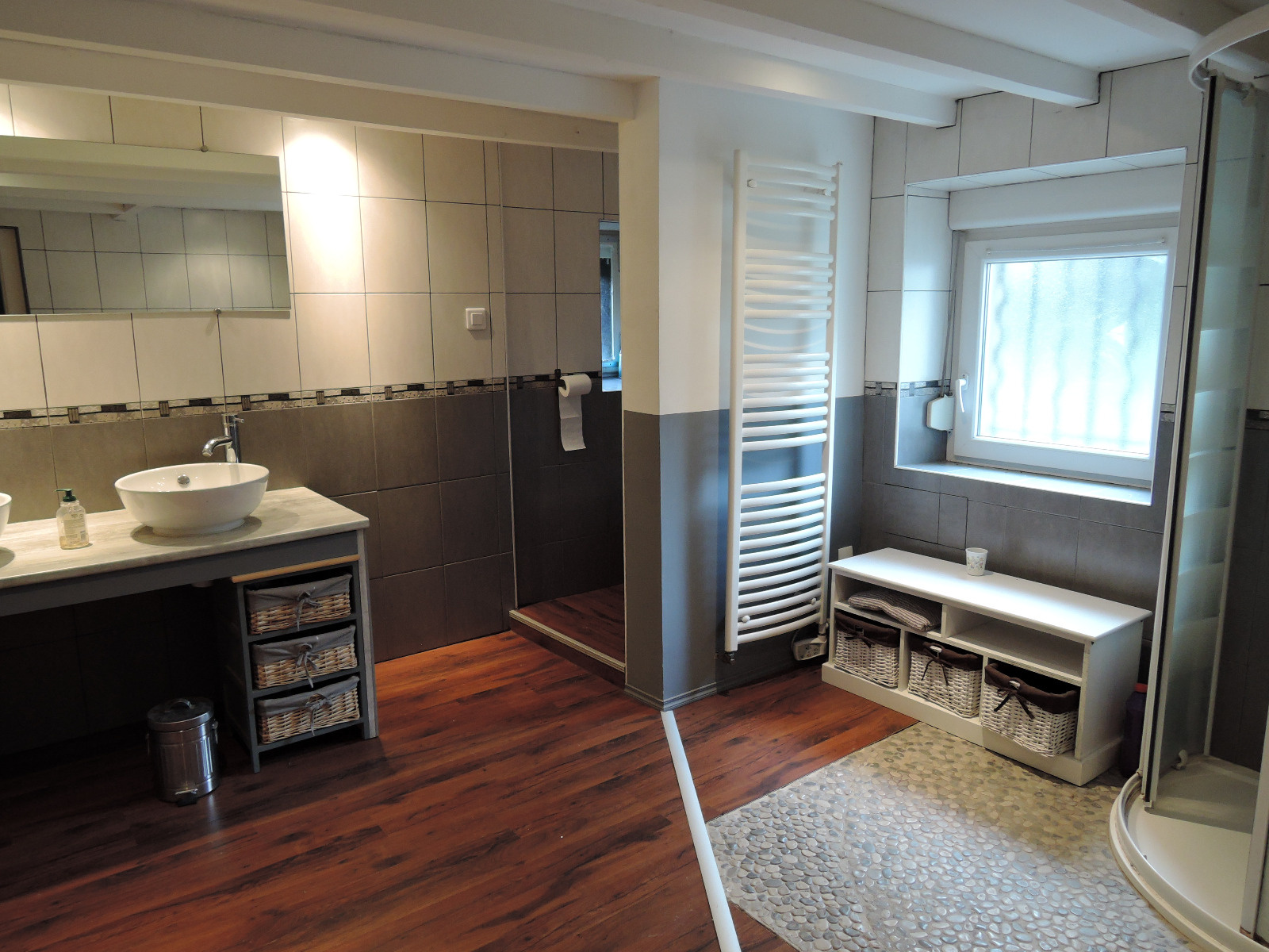 - à l'étage : 2 belles chambres avec parquet flottant, très belle salle de bain avec baignoire, débarras
