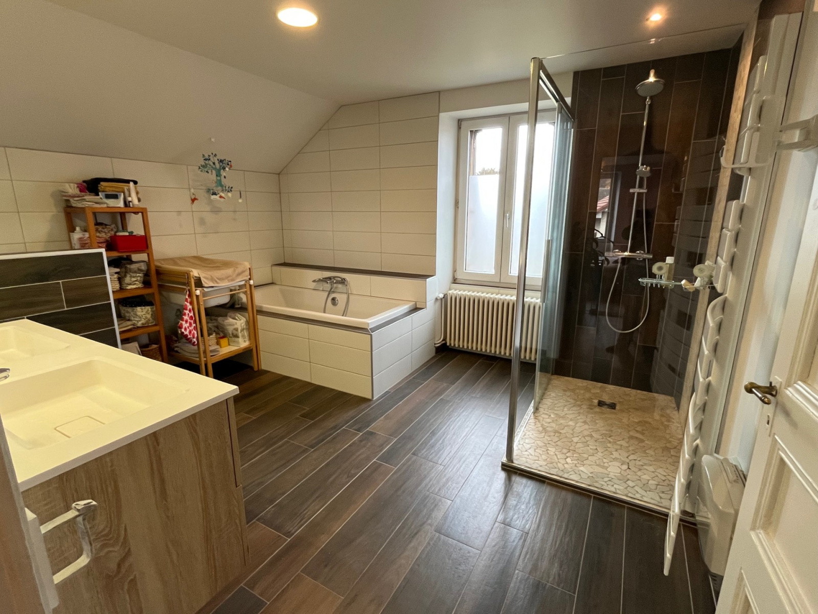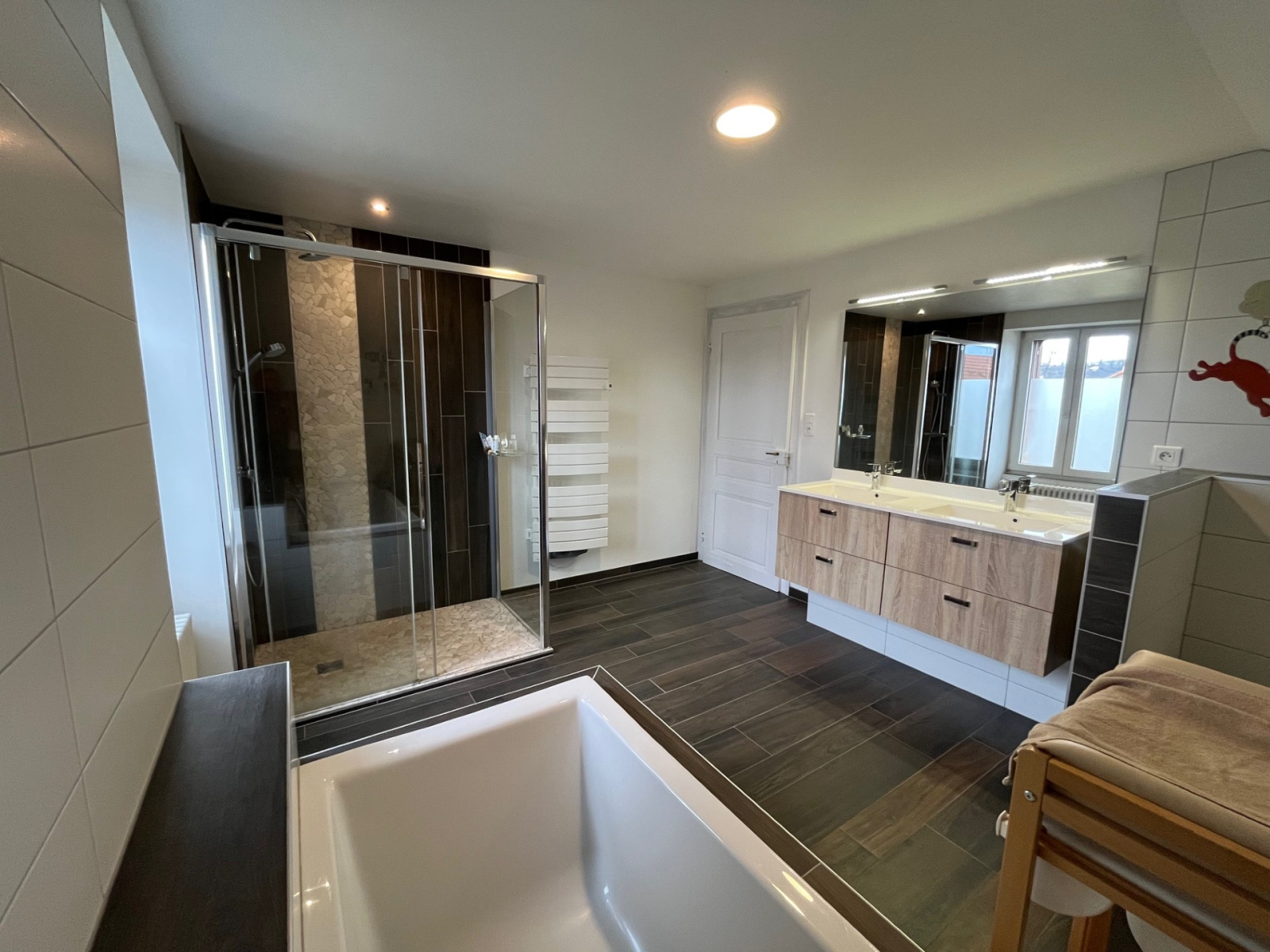- étage : dégagement et mezzanine, 3 chambres et une salle de bain complète (douche, baignoire, double vasque et wc)