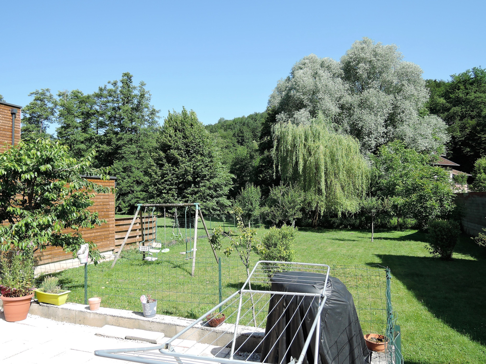 - à l'extérieur: une cour devant la maison et le jardin à l'arrière.